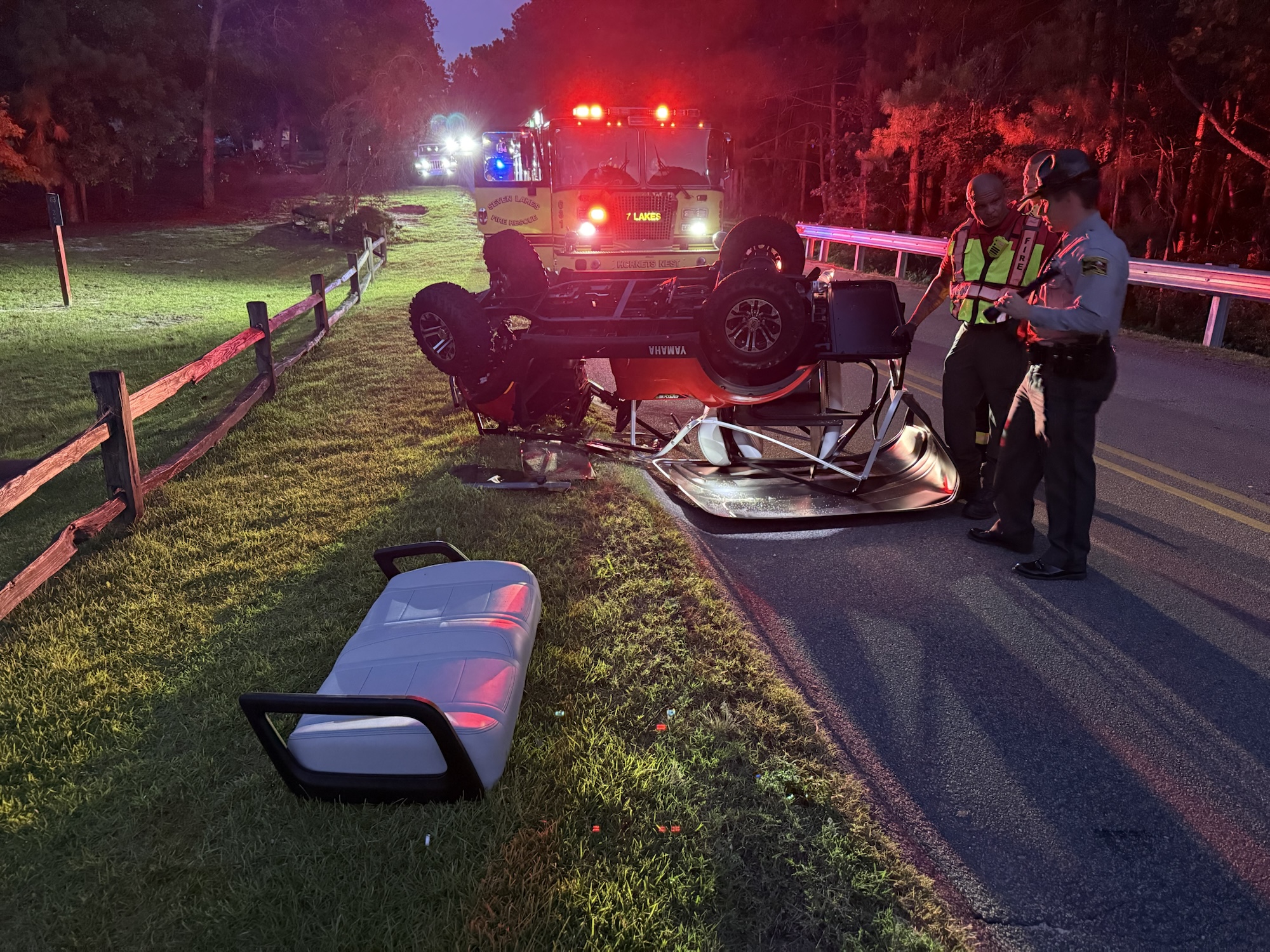 First responders said at least two of the occupants were pinned beneath the overturned cart. Both were airlifted to the hospital from a landing zone set up at the Seven Lakes Fire Station.