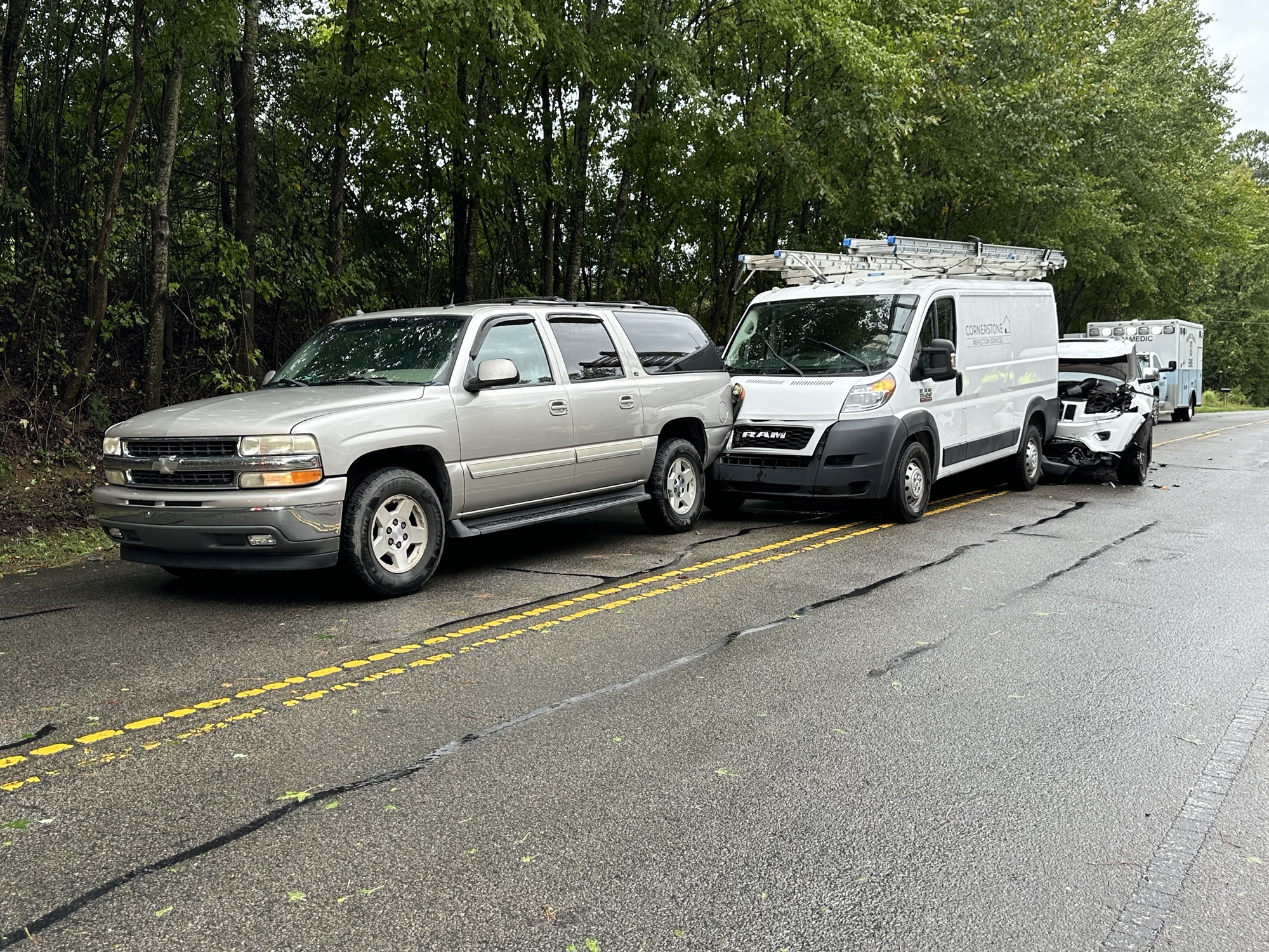 The two occupants of the Suburban were transposed to the hospital with minor injuries. The driver of the Jeep was evaluated at the scene. The driver of the RAM work van was not injured.