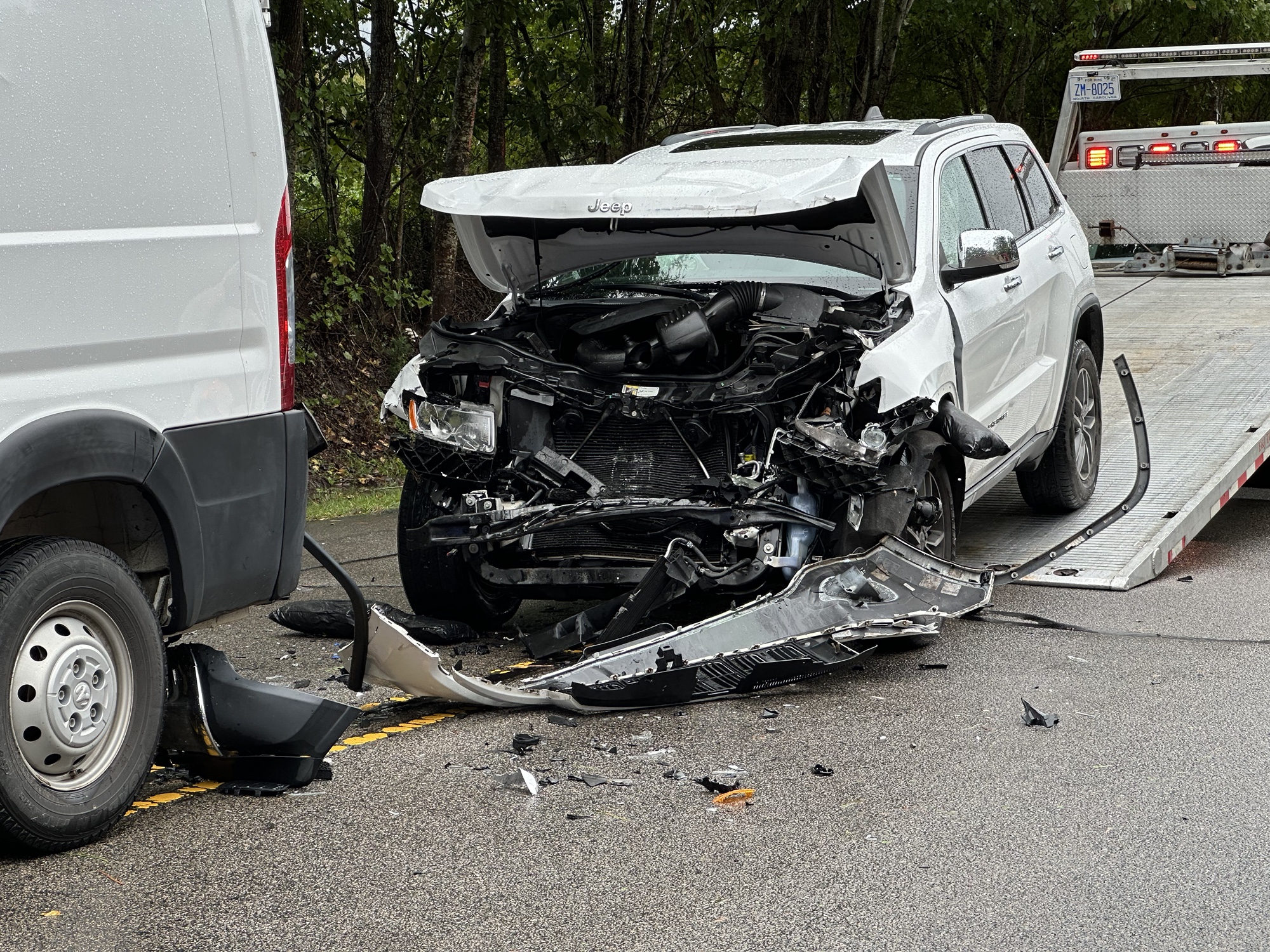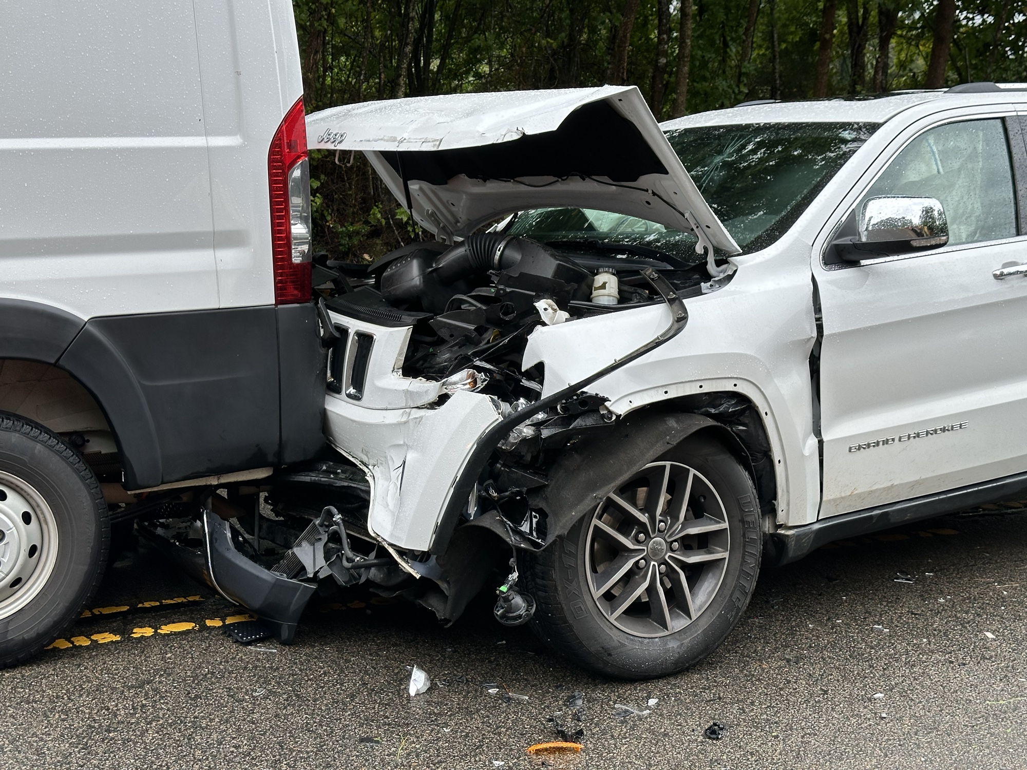 According to authorities, the first crash happened when an Acura traveling east on the highway struck the tree in the road way. A passenger from the Acura was removing the tree from the roadway when the second crash happened. In the second crash, the driver of a Jeep Grand Cherokee slammed into the back of a RAM work van that was stopped on the highway because of the downed tree. The impact caused the work van to collide into the back of a Chevrolet Suburban, also stopped because of the tree.