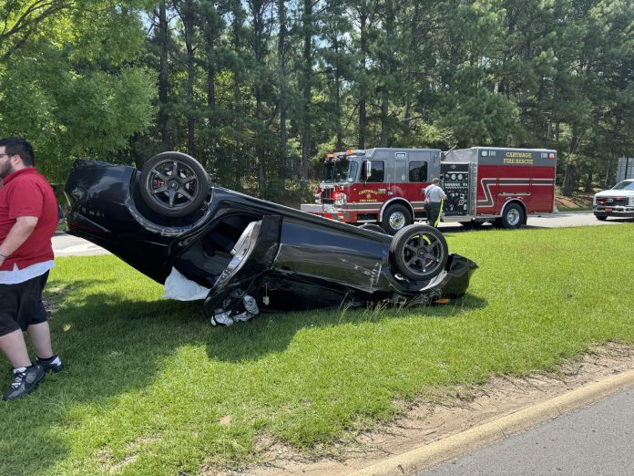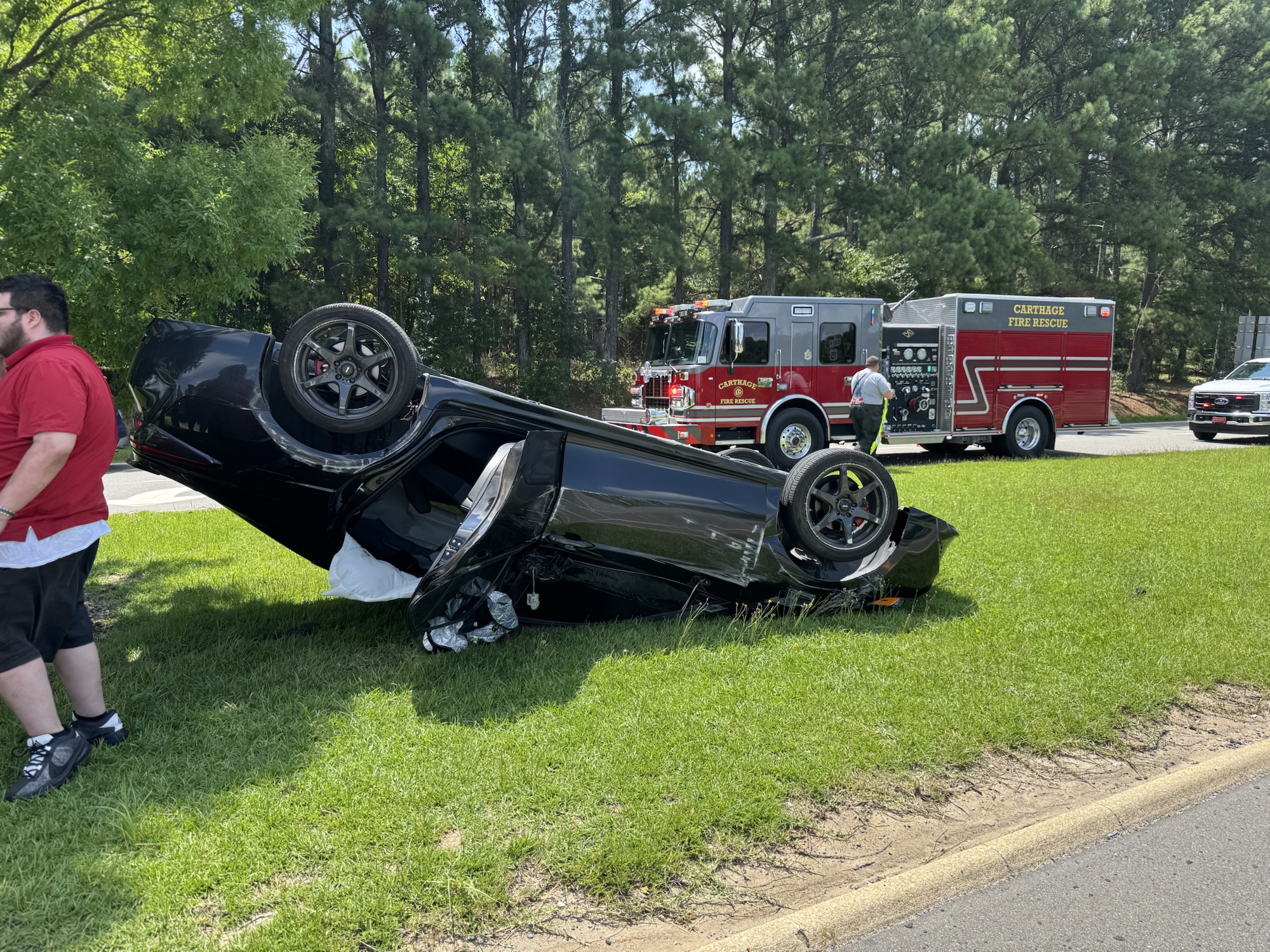 A two-vehicle crash along U.S. Highway 15-501 caused one vehicle to overturn late Monday morning, according to Carthage Police.