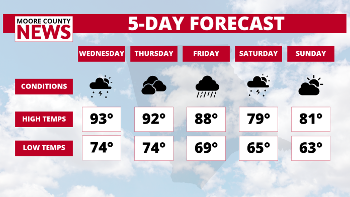 The forecast calls for highs in the upper 70s to low 80s across Moore County on Saturday and Sunday, with scattered showers and thunderstorms likely both days. The stretch of wet weather is expected to bring temporary relief after weeks of intense heat and humidity.