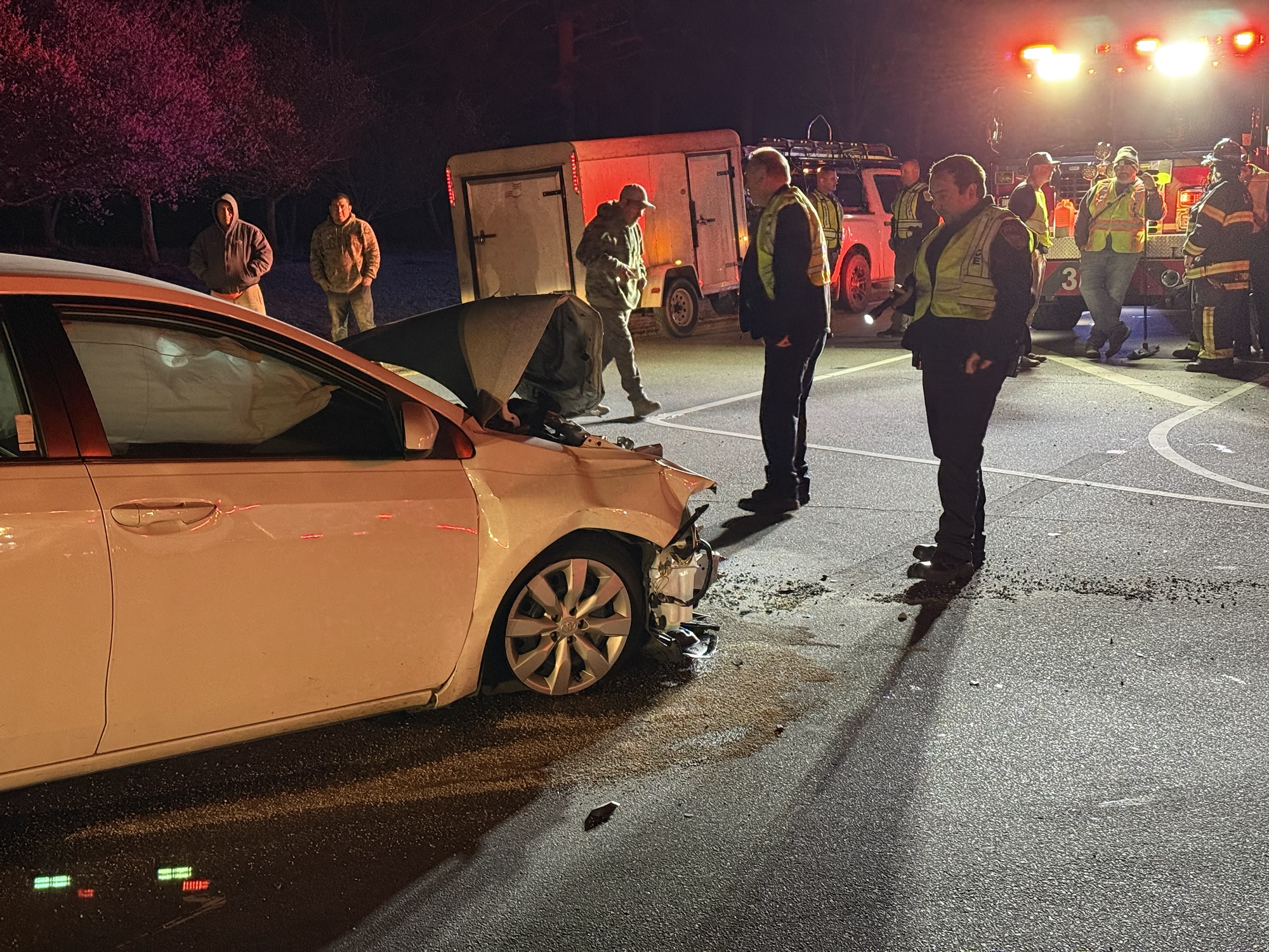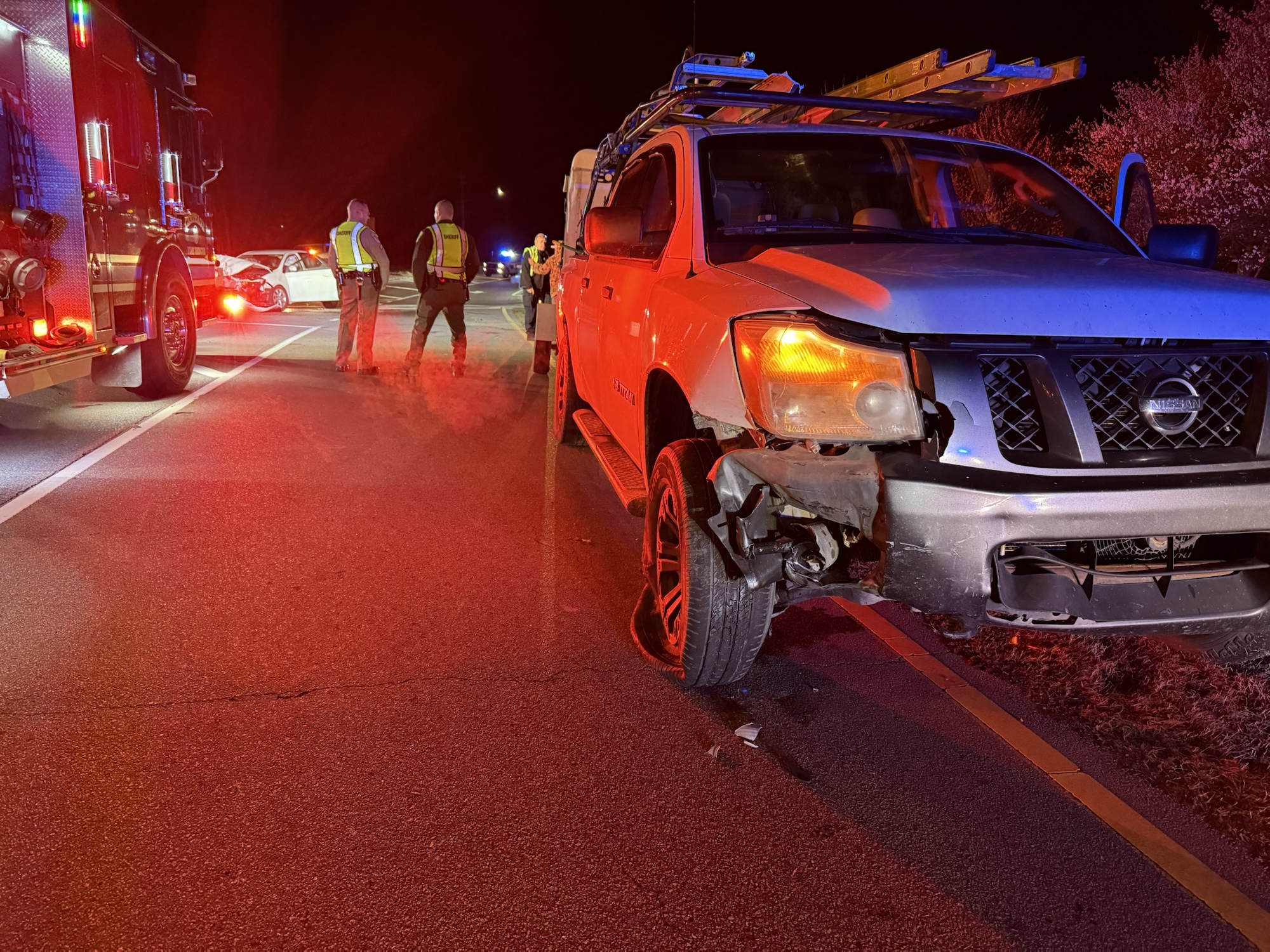 According to police, the driver of a Toyota sedan pulled out in front of a Nissan Titan pickup truck. The front end of the Toyota sustained heavy damage, while the Titan suffered damage to its right side and a blown tire.