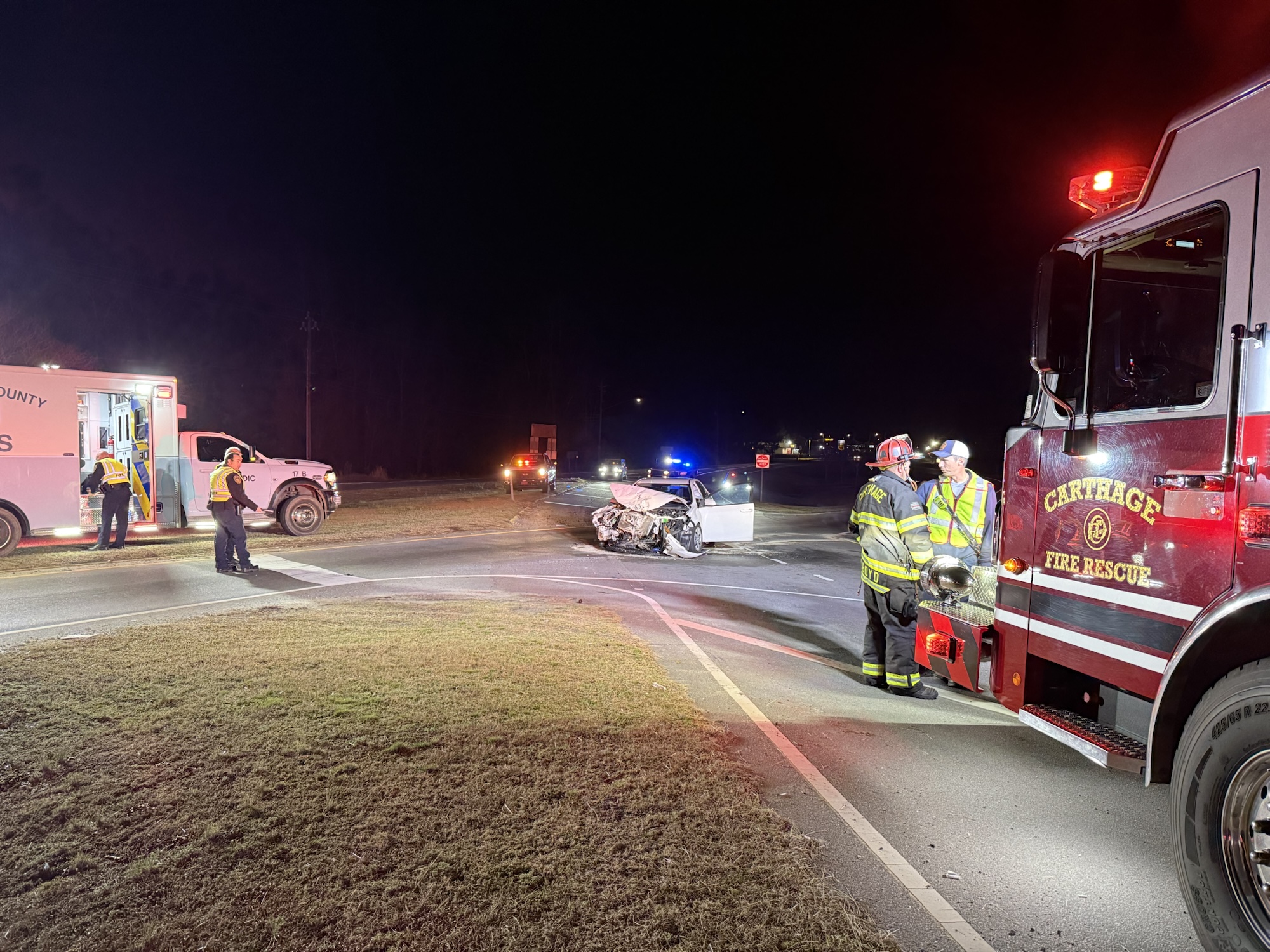 This intersection has been the site of several crashes, as vehicles pulling out from Monroe Street attempt to cross the southbound lane of Highway 15-501, often into the path of oncoming traffic. Carthage Police told Moore County News at the scene that the cause of Friday’s crash is consistent with previous incidents.