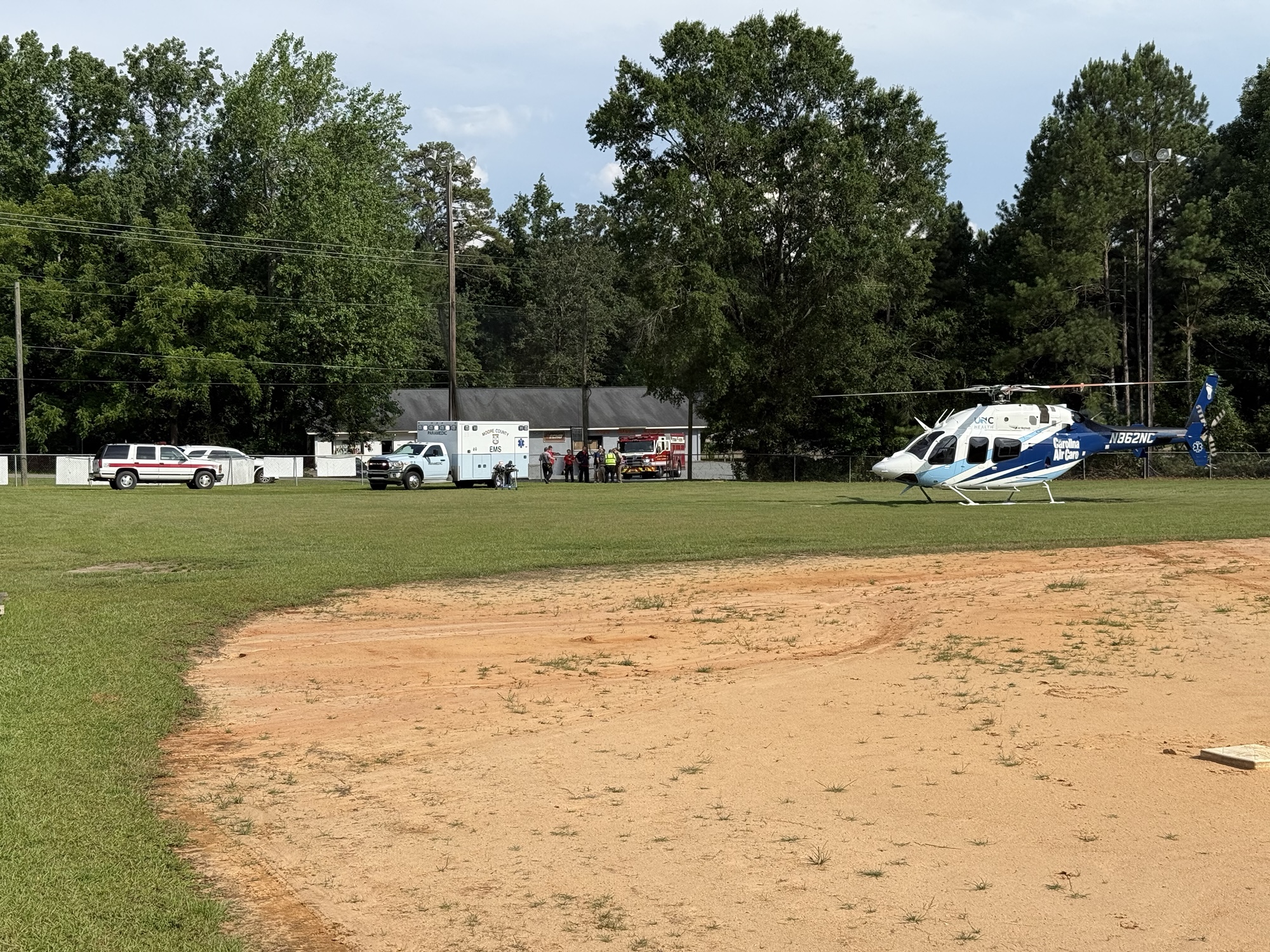 Emergency crews responded to the scene and requested a medical helicopter. A landing zone was set up at the Vass ball field for UNC Carolina Air Care. However, after paramedics transported the driver to the landing zone, medical personnel determined it was not necessary to airlift her. She was instead taken by ambulance to Moore Regional Hospital for treatment.