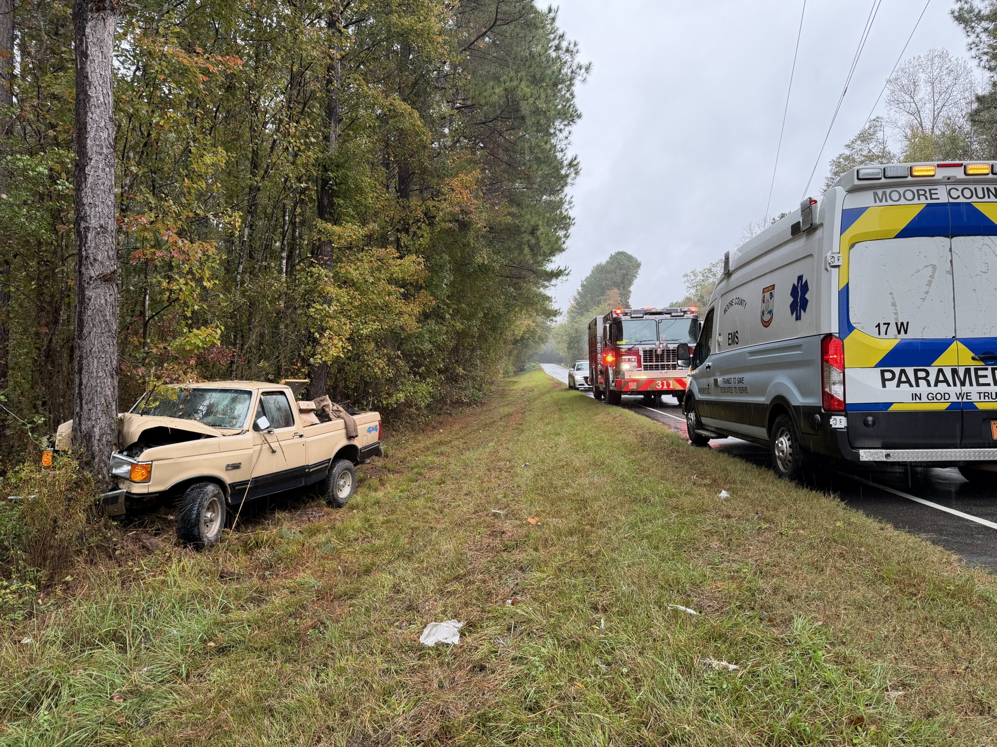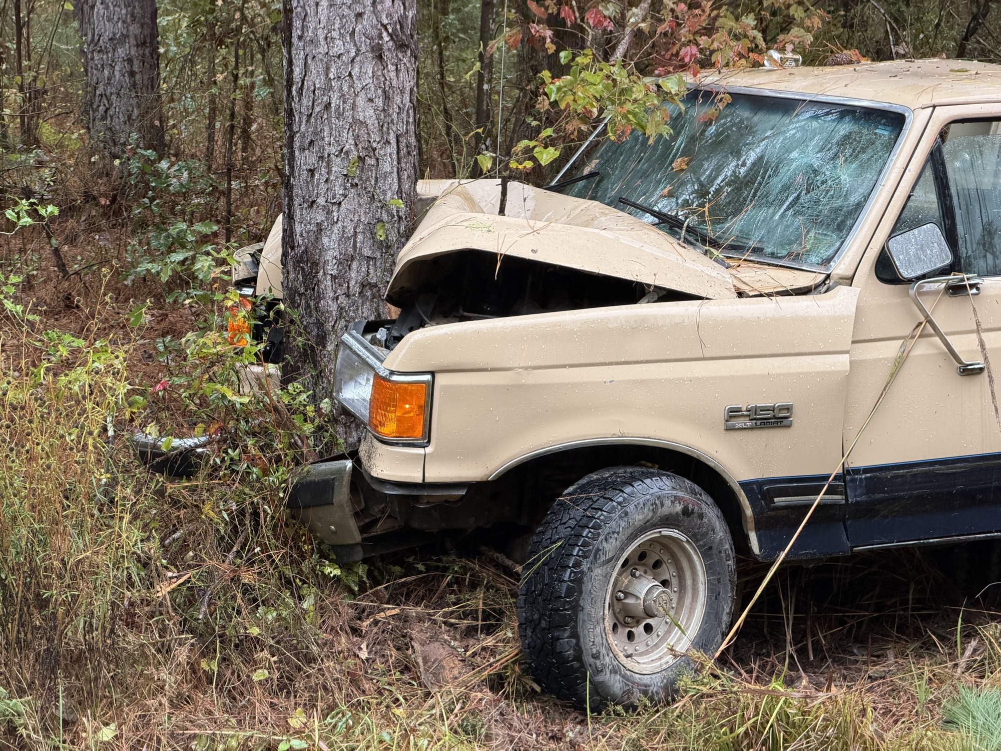 The crash happened just after 2 p.m. when an older model Ford F-150 ran off the right side of the road and hit a tree head-on.