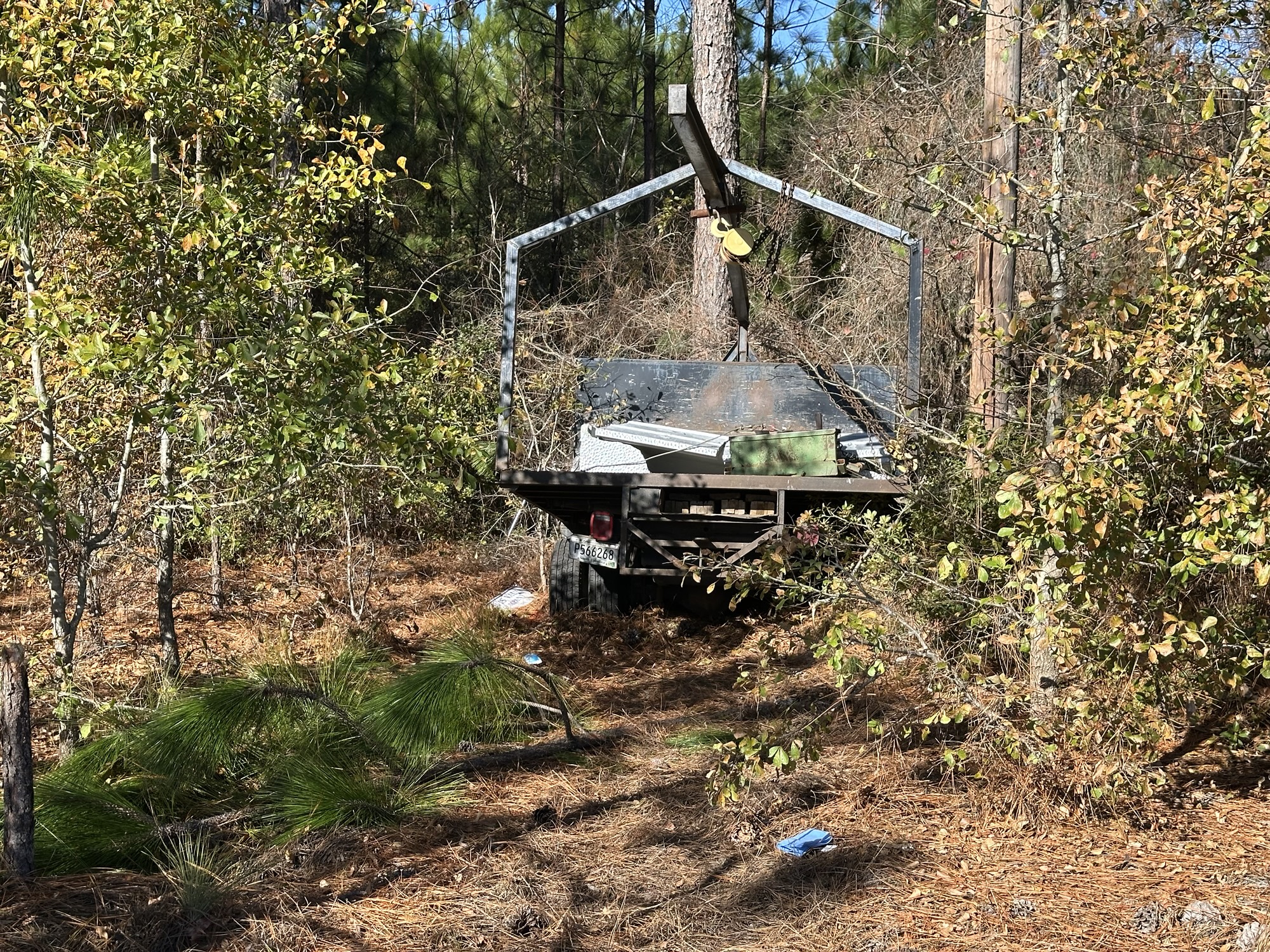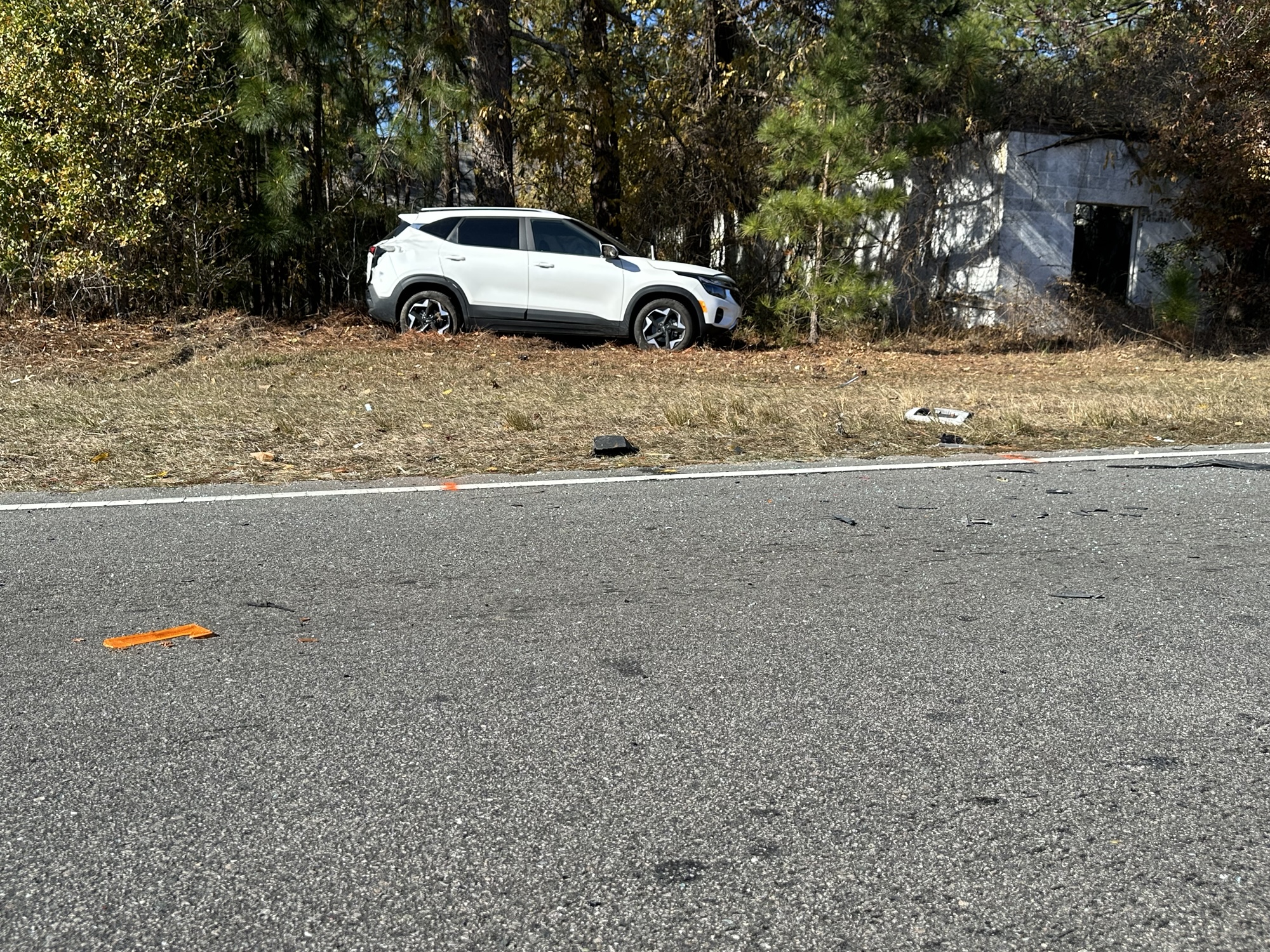 A witness told Moore County News that the driver of a Kia Seltos ran the stop sign, into the path of a casket vault truck. Both vehicles went off the roadway, and the vault truck stuck a tree.