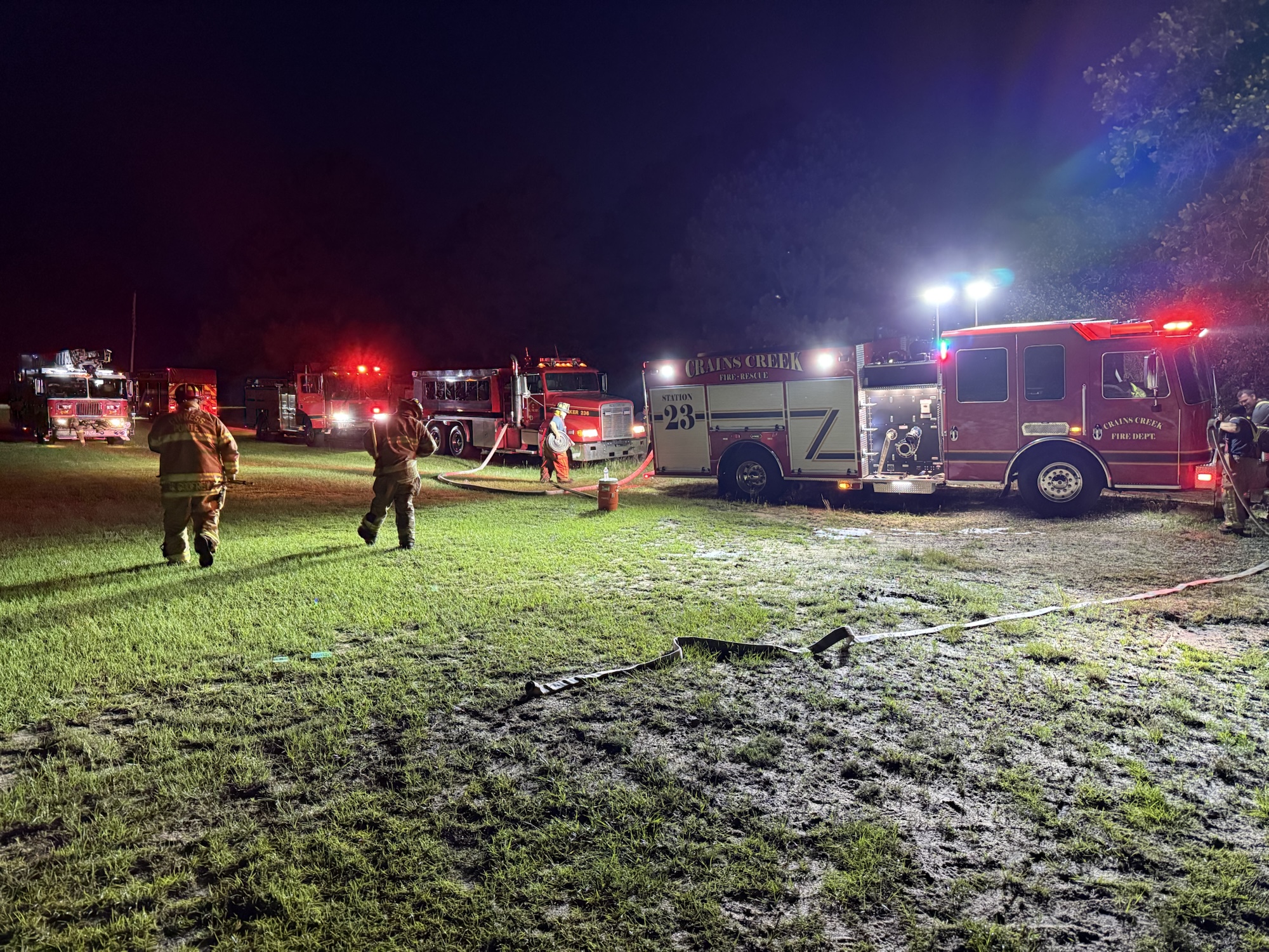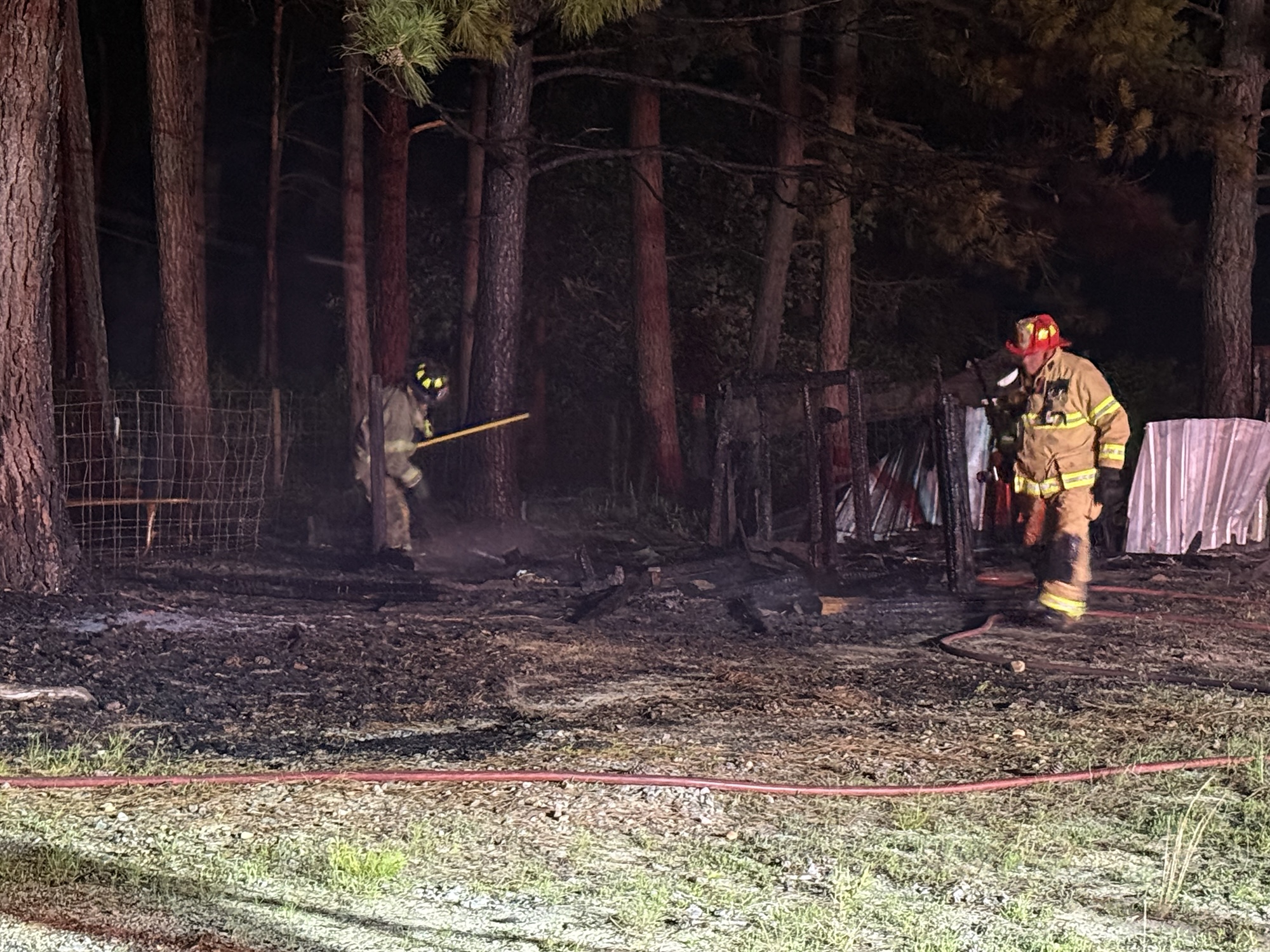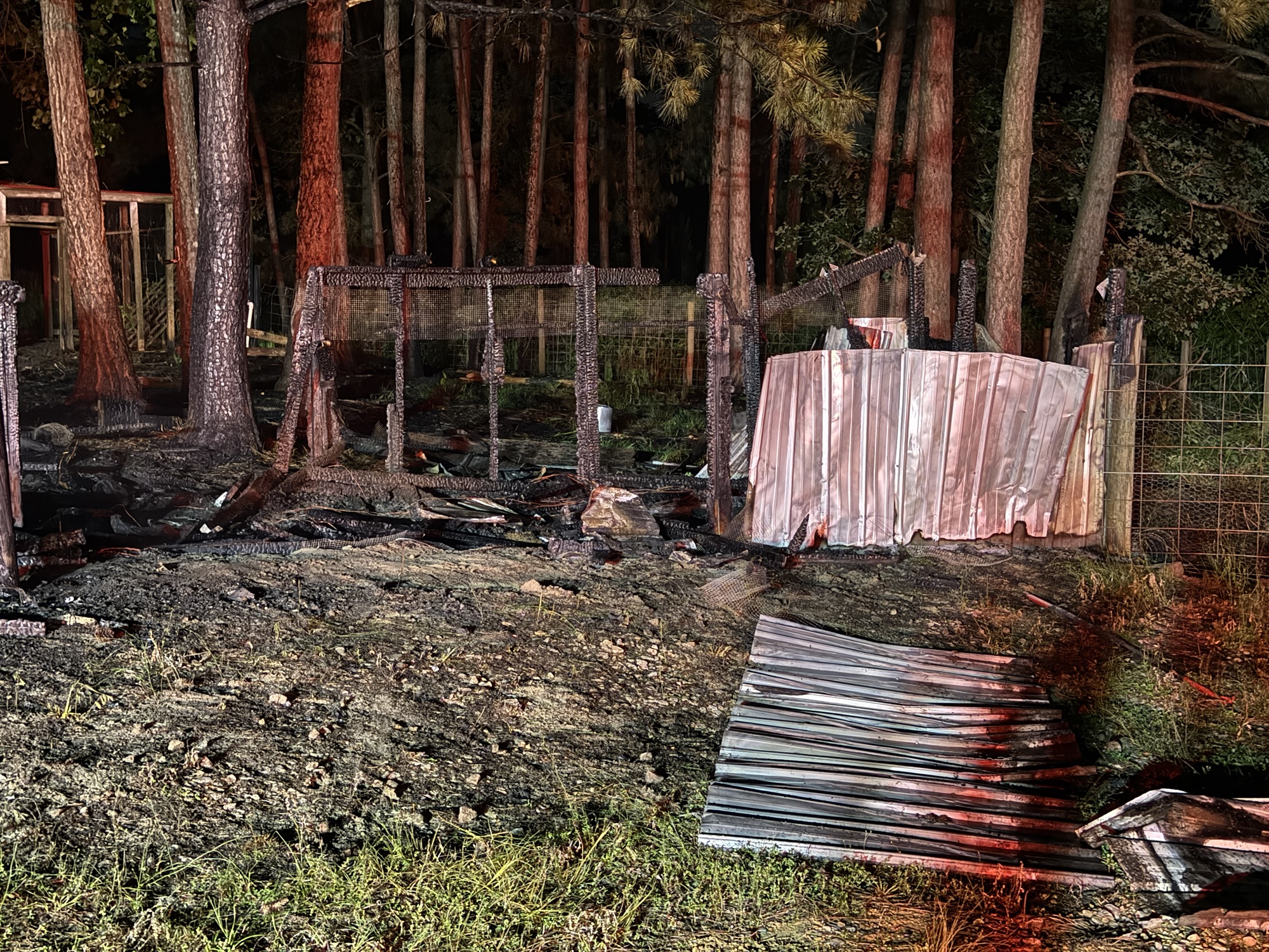 Crews were called to the scene shortly before 9 p.m. and found a small outdoor chicken coop fully engulfed in flames, with fire spreading into the nearby wooded area.