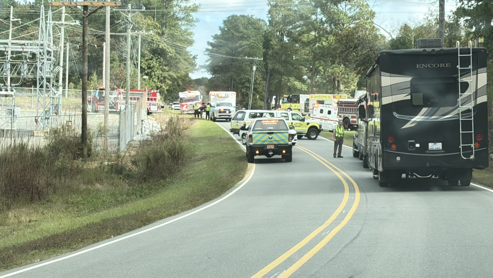 Authorities shut down Doubs Chapel Road between Highway 15-501 and Murdocksville Road so fire trucks could set up for water supply and safely battle the blaze.