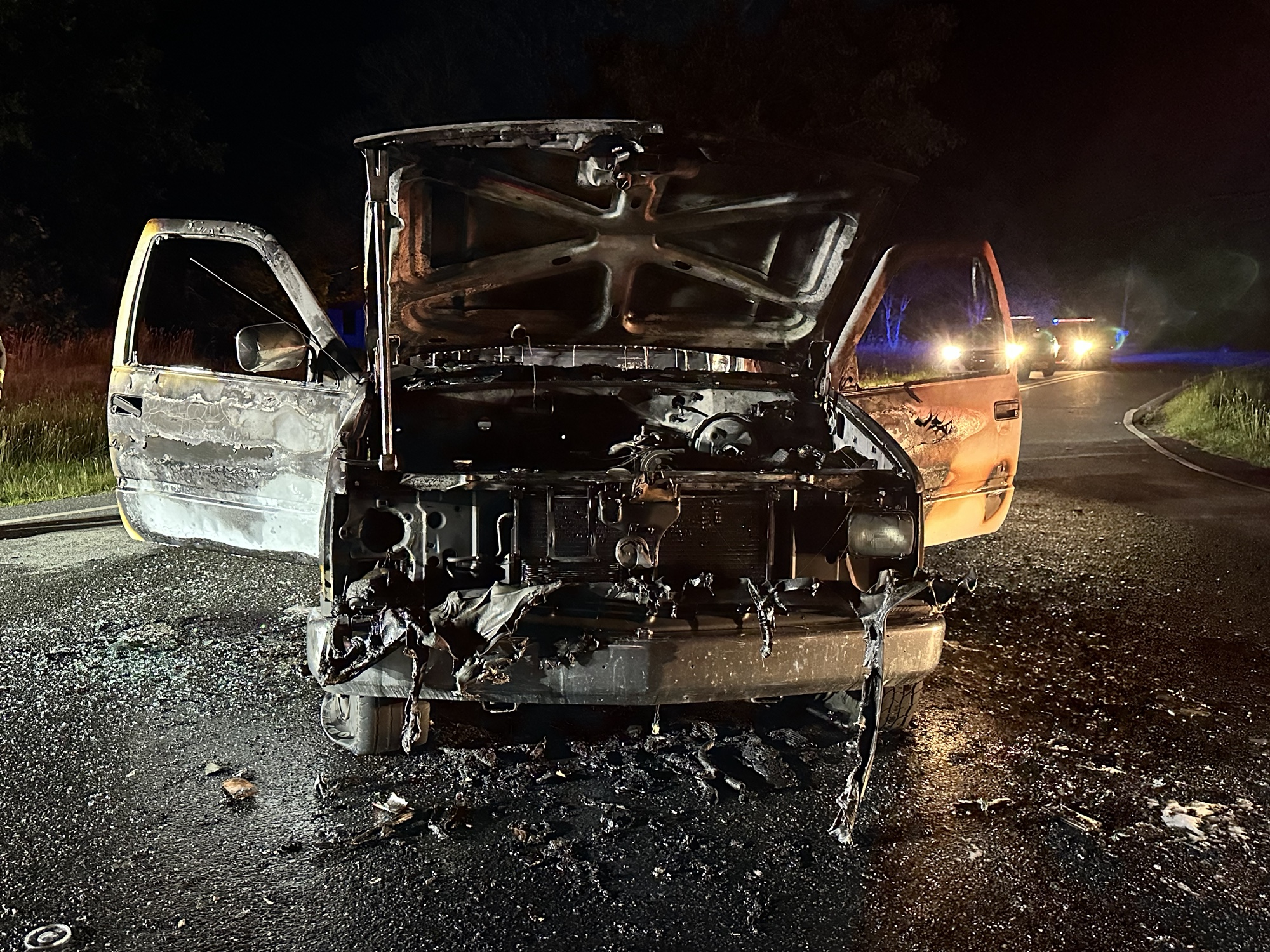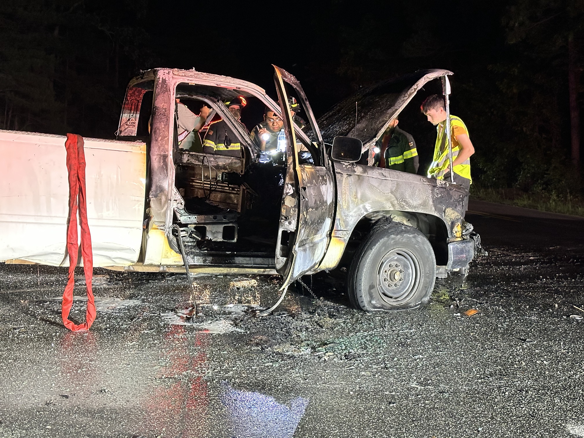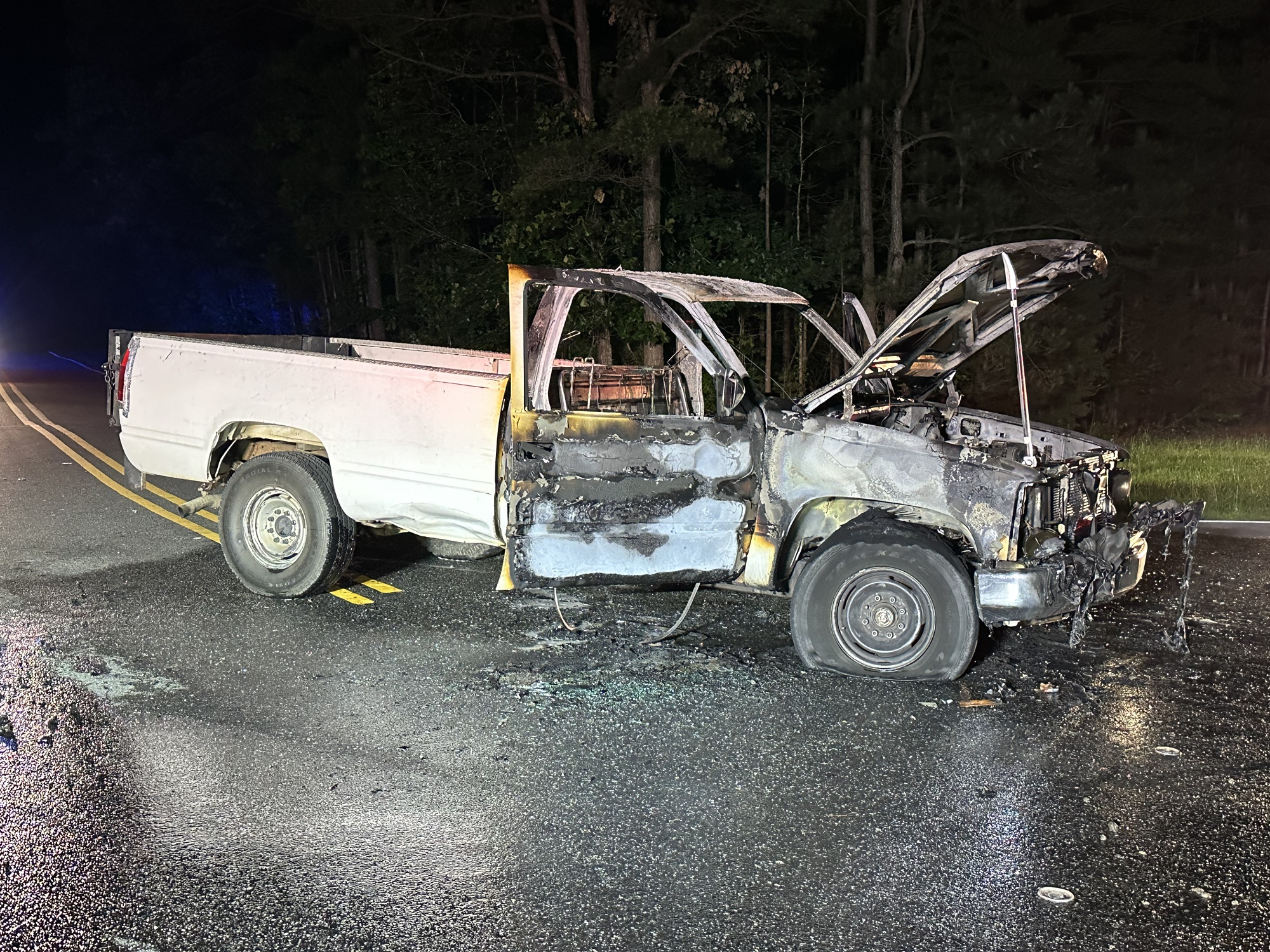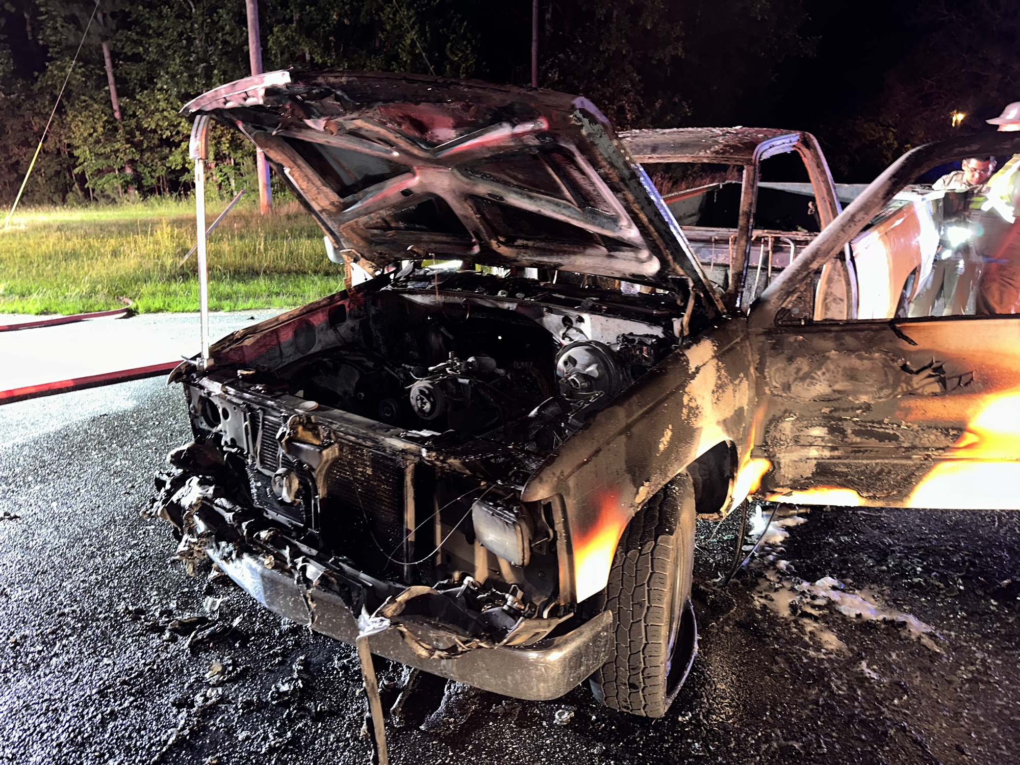 The entire front end of the truck was complete gutted by the flames. The seat and steering wheel wire framing was the only thing left in the cab of the truck.