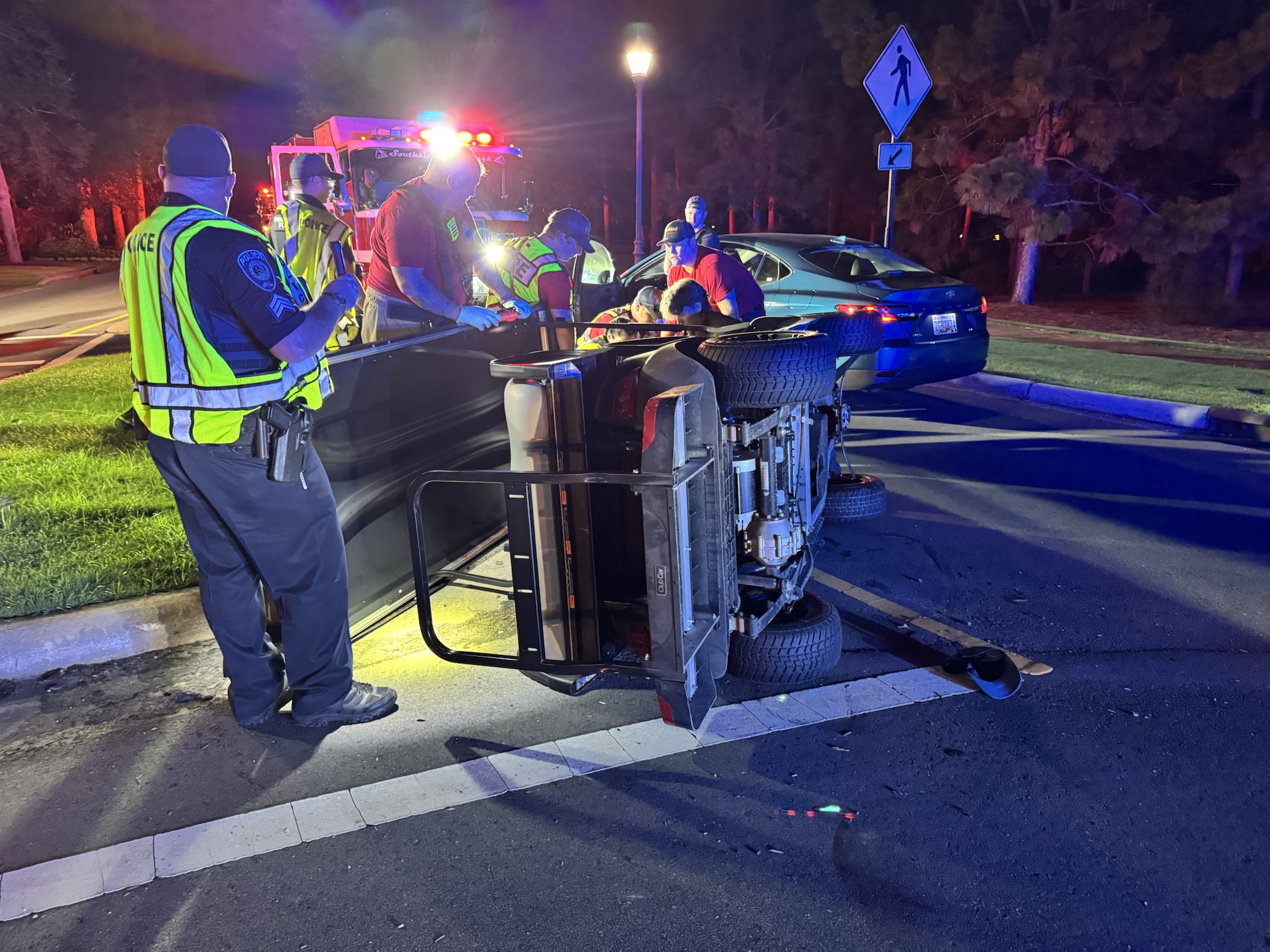 The collision happened shortly after 9 p.m. at the small traffic circle near the club entrance, where a Toyota sedan struck the golf cart, tipping it onto its side. Fortunately, according to officials, no one was seriously injured in the incident. One person from the golf cart was transported to the hospital as a precaution.