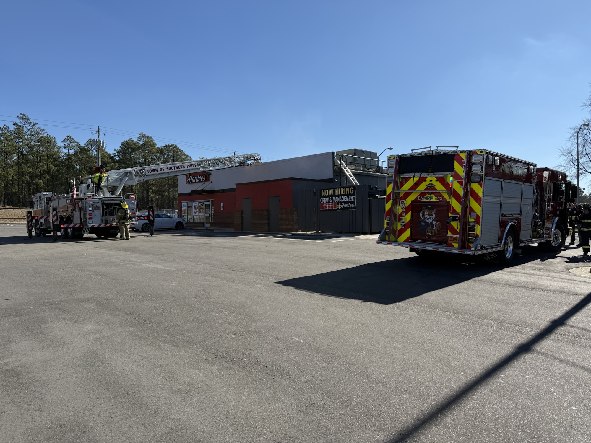 Around noon on Monday, firefighters were dispatched to eatery for a reported grease fire in the kitchen. Pinehurst Fire personnel were getting take out from Hardee’s when they smelled an odd odor. They went back into the restaurant and were able to start extinguishing the flames.
