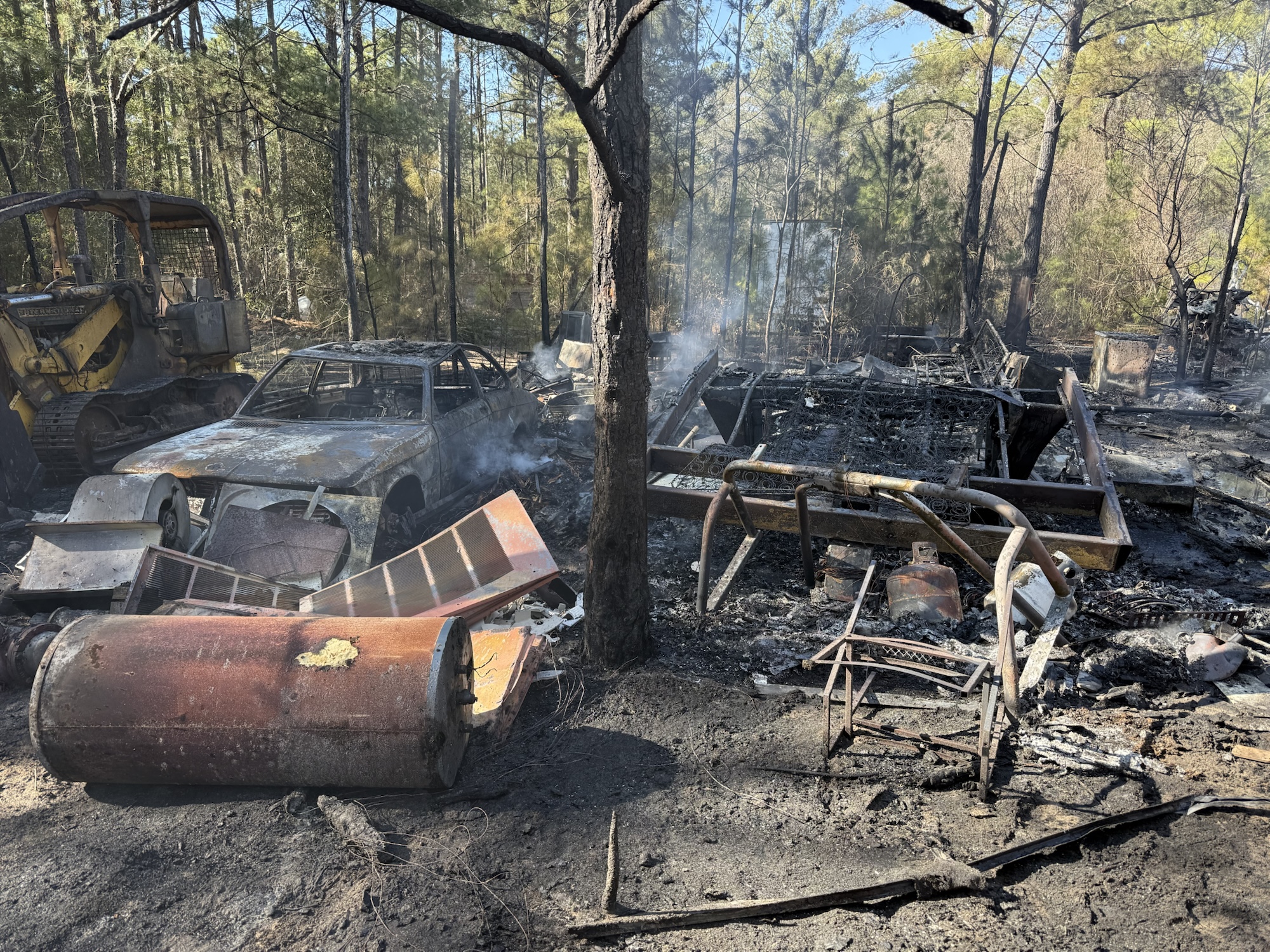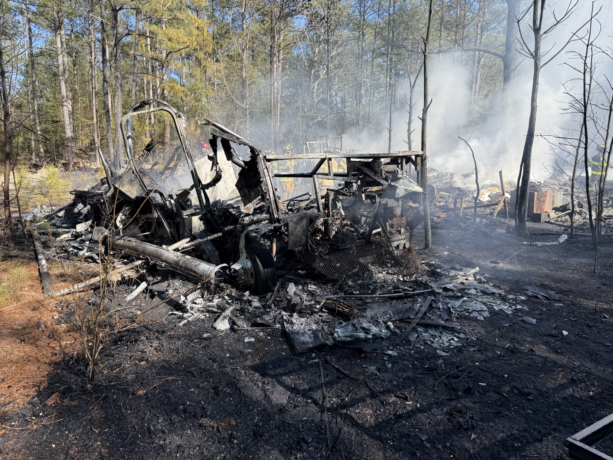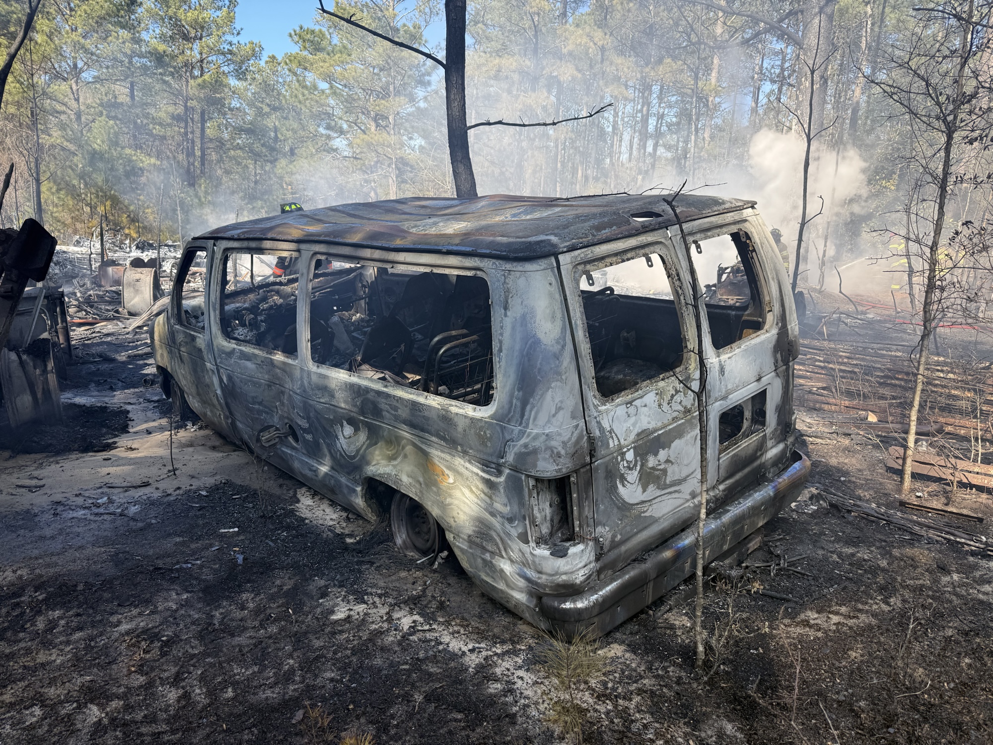 A large outdoor fire near Foxfire engulfed multiple vehicles, a building, and a camper off Foxfire Road on Sunday afternoon, leaving them completely destroyed.