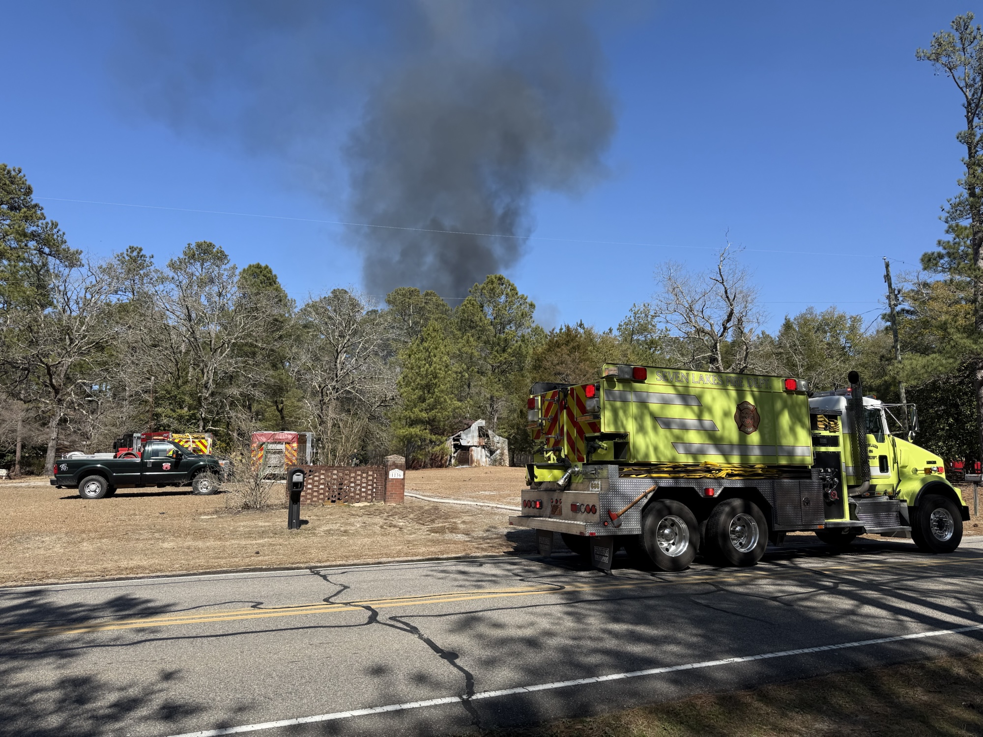 The two-alarm fire broke out shortly before 1:15 p.m. and was soon upgraded to a structure fire. Fire crews from across Moore County responded to the scene in the 1100 block of Foxfire Road, near Pinecrest Court Road.
