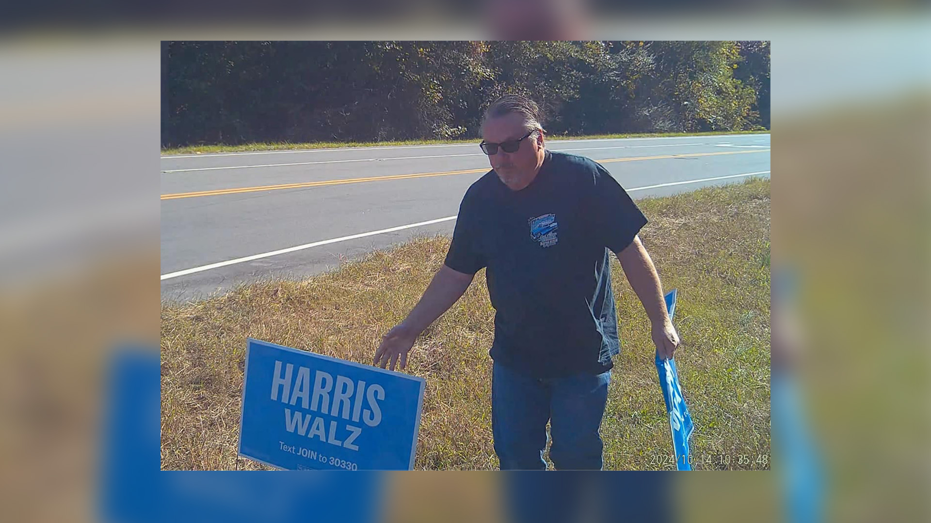 A man that was caught on video stealing roadside political signs for the Harris/Walz campaign has been arrested, according to the Moore County Sheriff’s Office. The video that started circulating on Facebook on Monday, show a man walking along U.S. Highway 24-27 in broad daylight yanking two political signs out of the ground before he walks out of frame.