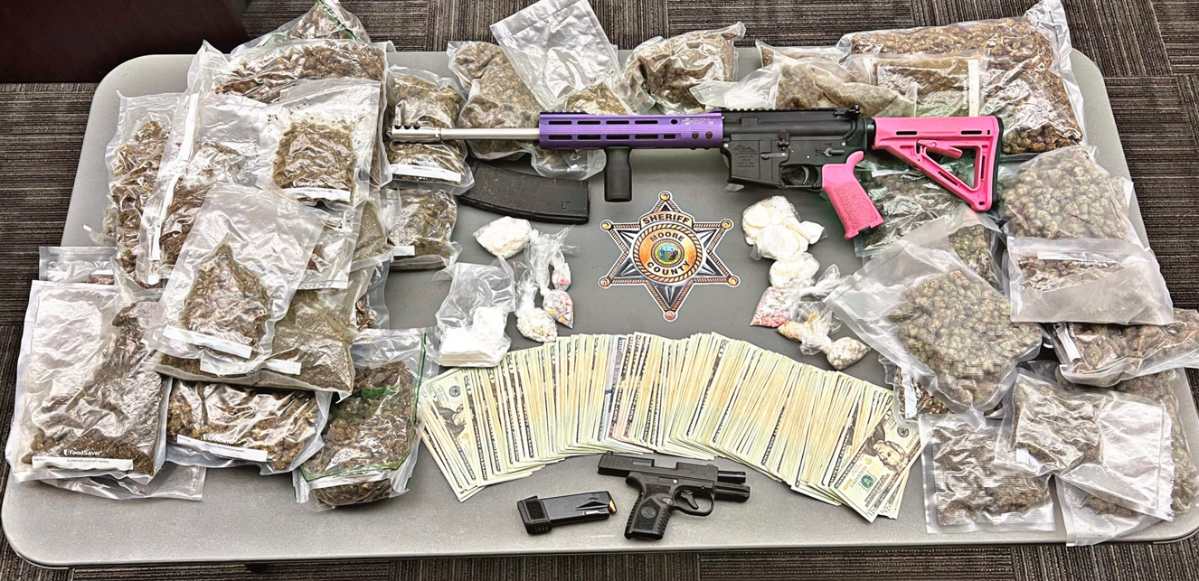 Sheriff Ronnie Fields announced the arrest following a search conducted by Moore County Sheriff’s Office detectives on March 28, 2025. According to the MCSO, the operation took place at a home in the 100 block of Mitte Road, where investigators seized 12.3 ounces of cocaine, 13 pounds of marijuana, 233 dosage units of MDMA (ecstasy), drug paraphernalia, two firearms, and more than $6,500 in cash.