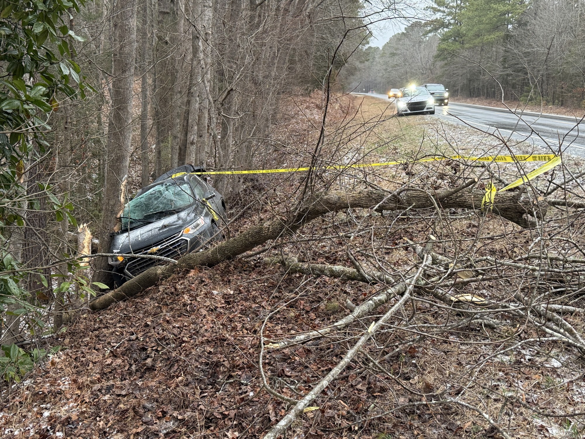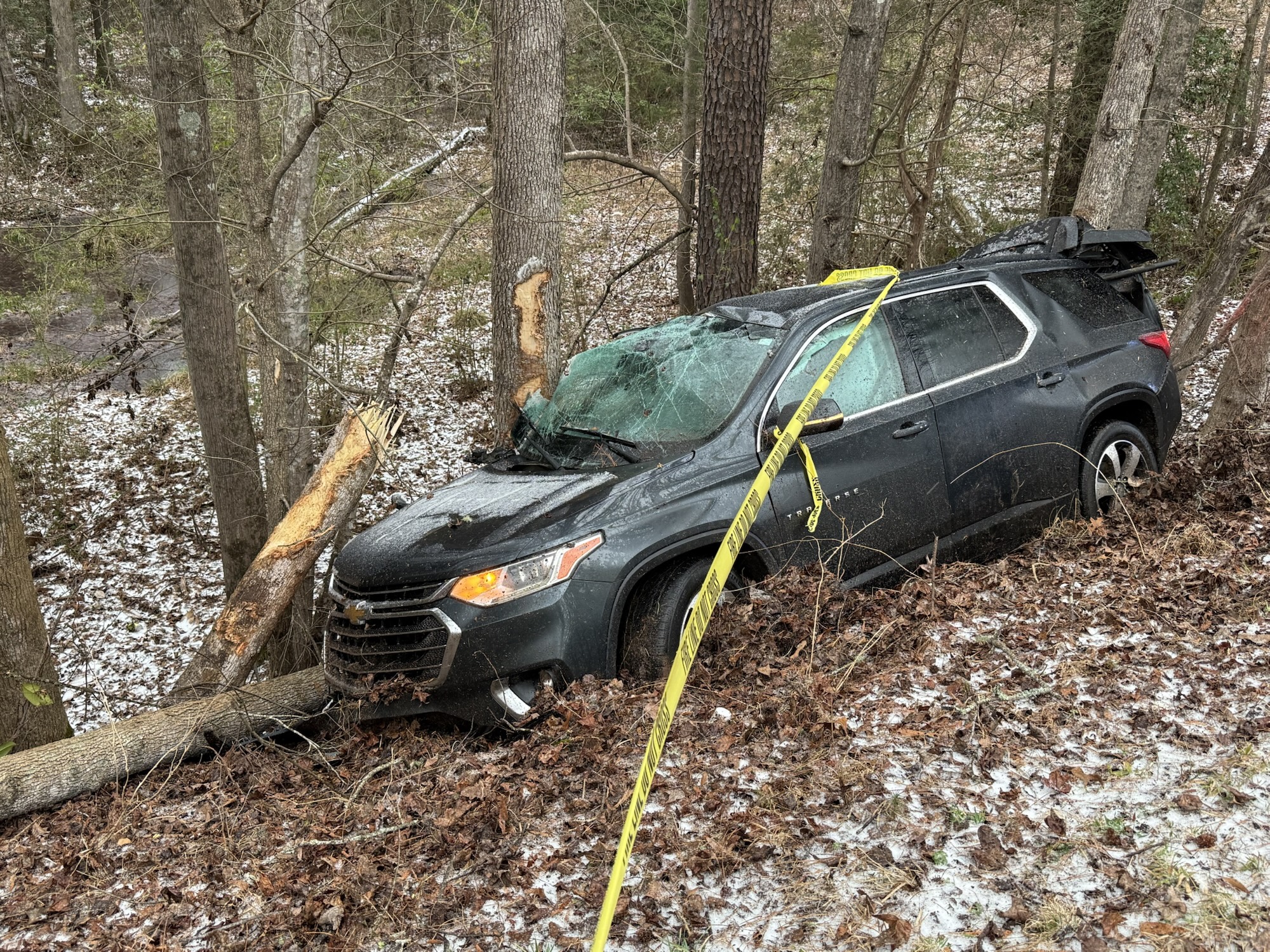 Moore County News visited the scene of an SUV that slid off Highway 15-501 near Little River. The SUV went down an embankment hitting several trees.