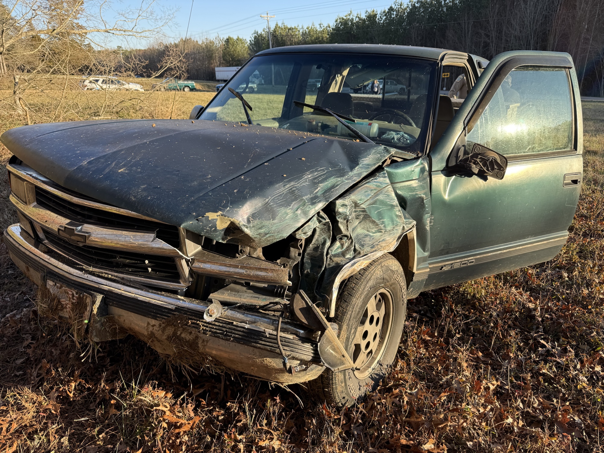 The pickup truck then veered into a ditch, went airborne, and landed several feet into a field before coming to a stop near a tree line. Reports indicate that tools from the truck bed were forcefully ejected, shattering the back windows and flying into the cab.