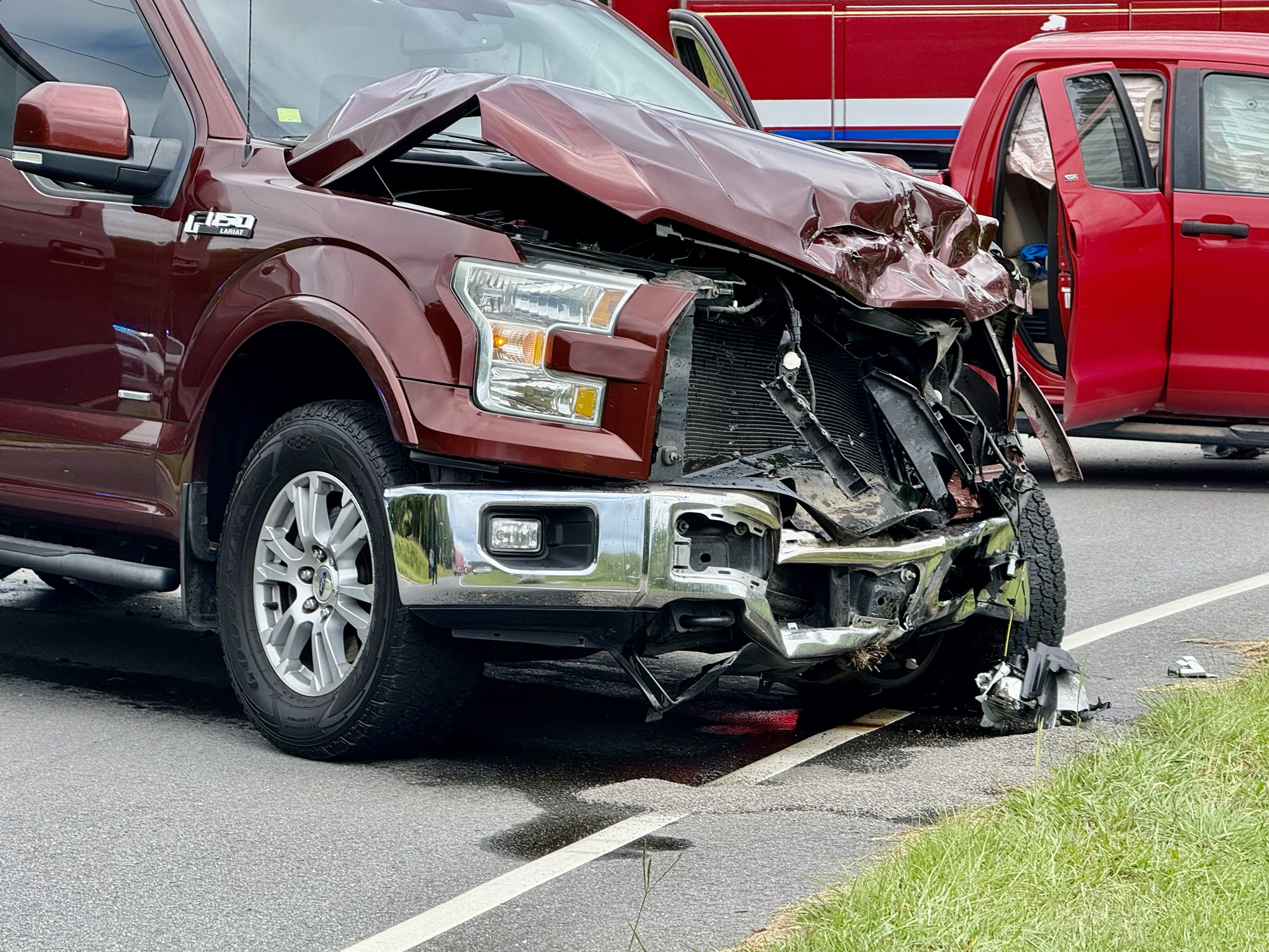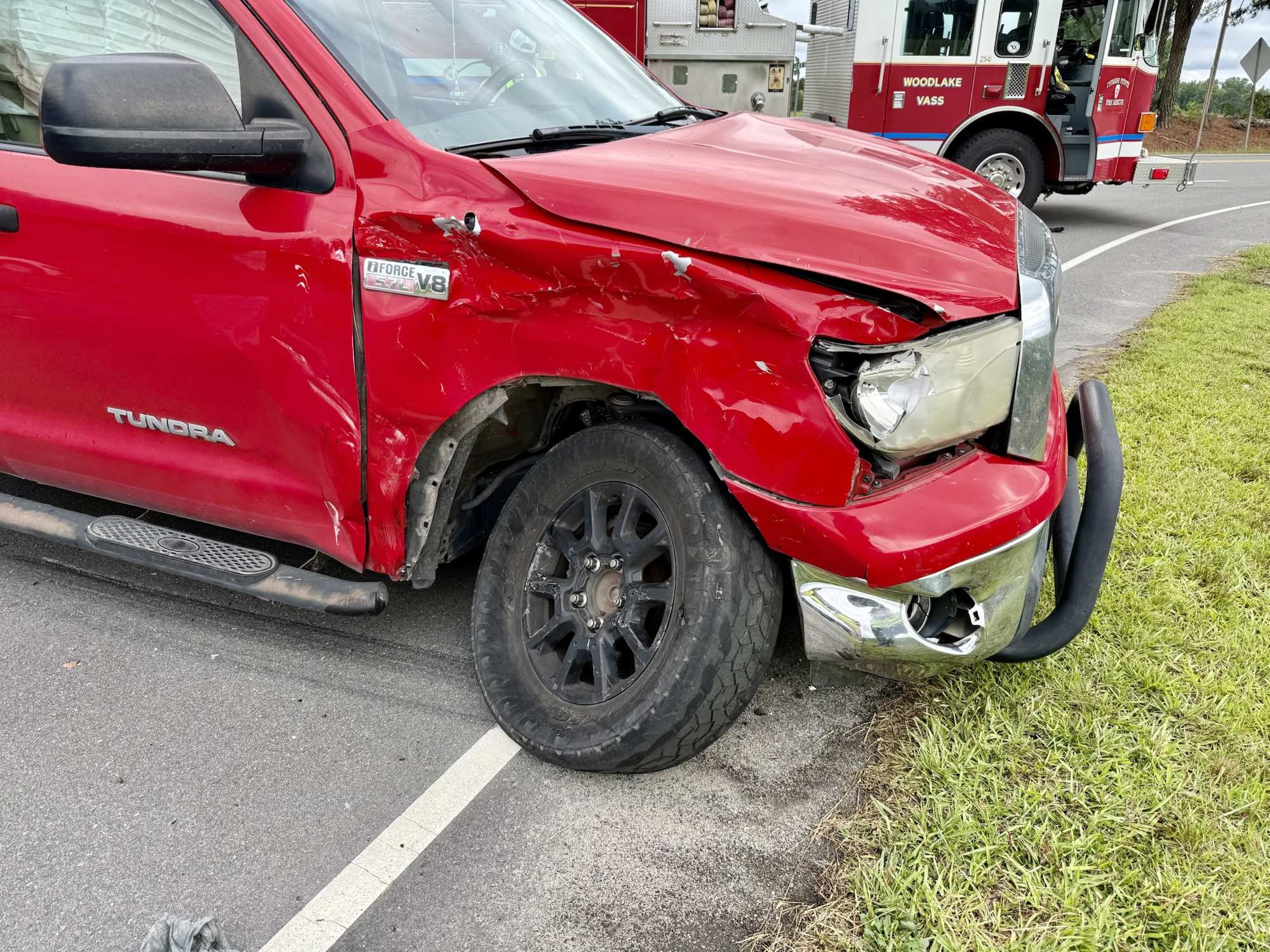 The F-150 struck the Tundra in the front passenger-side wheel in a T-bone impact. Both vehicles came to a stop in the southbound lane of Nickens Road, partially blocking traffic for a short period.