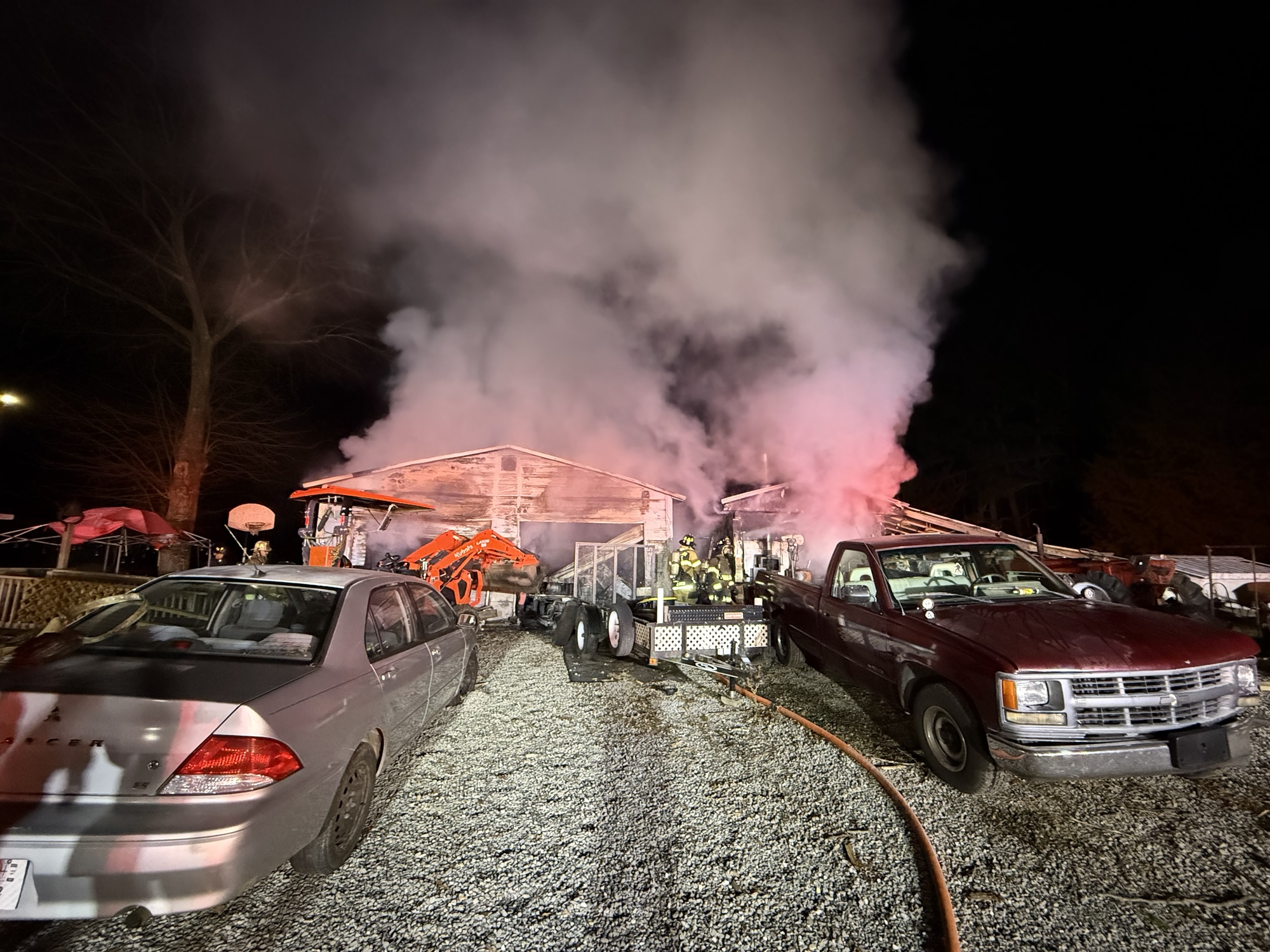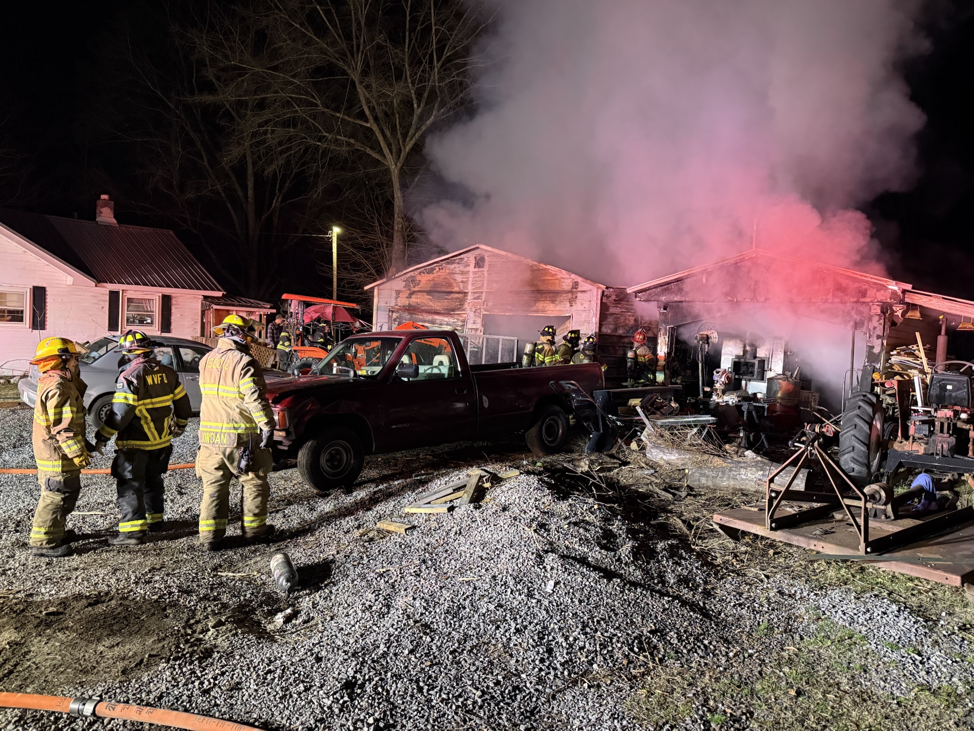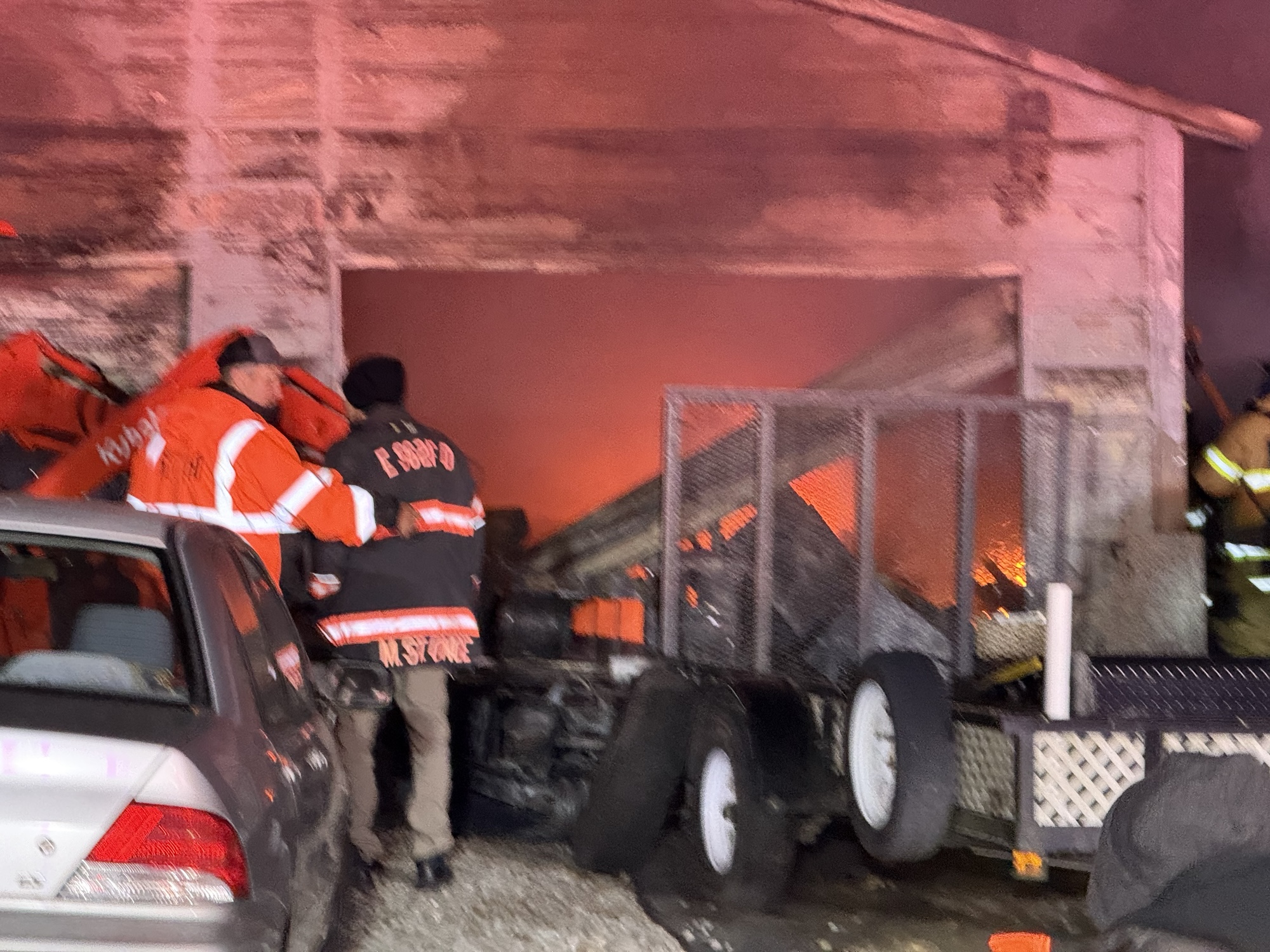 Firefighters arrived at the scene around 12:15 a.m. Sunday to find heavy flames engulfing a garage, with the fire also threatening nearby vehicles.