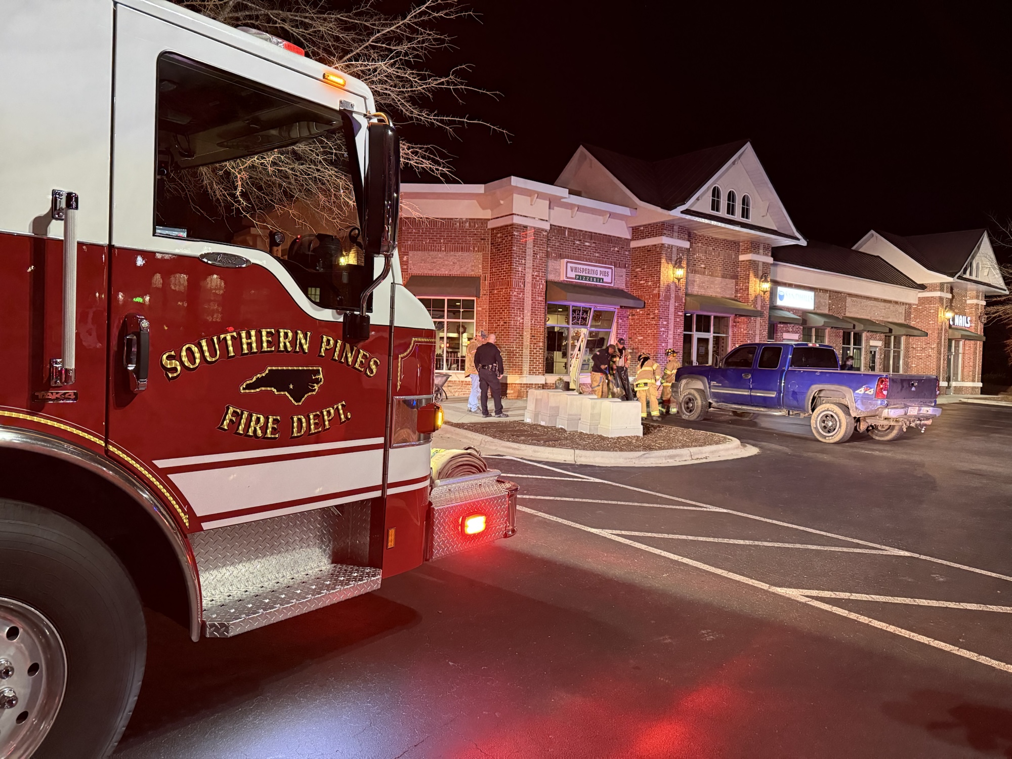 A Chevy pick-up truck crashed into Whispering Pies Pizzeria, causing significant damage to the front door. The incident happened Saturday just before 9:30 p.m.
