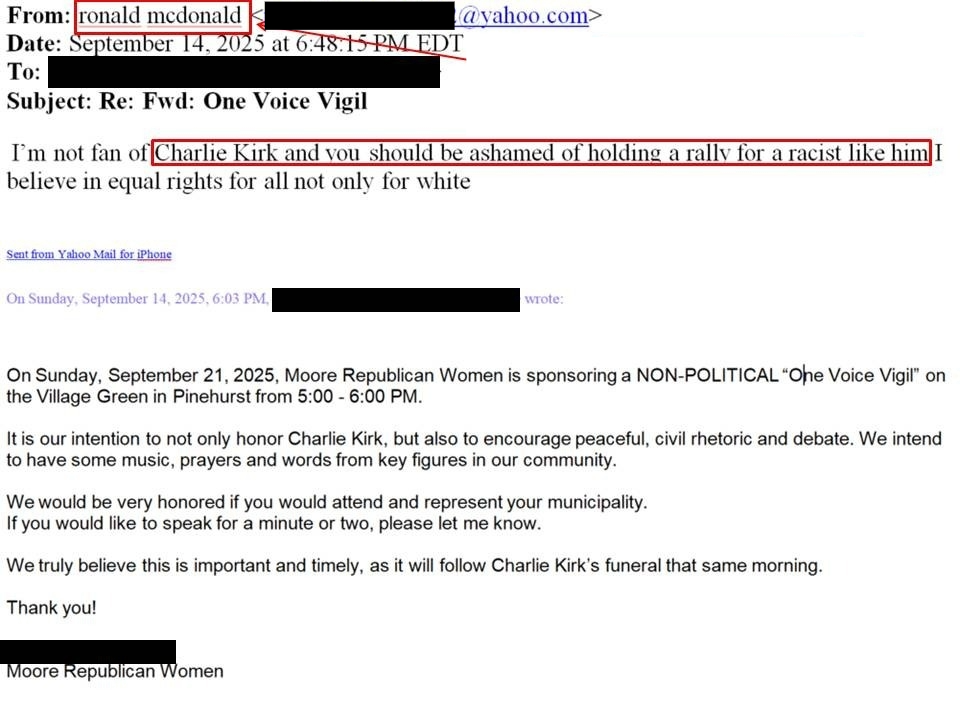 Pinebluff Mayor Ronald McDonald is under fire after an email he sent in response to an invitation to speak at a vigil for conservative activist Charlie Kirk surfaced online.