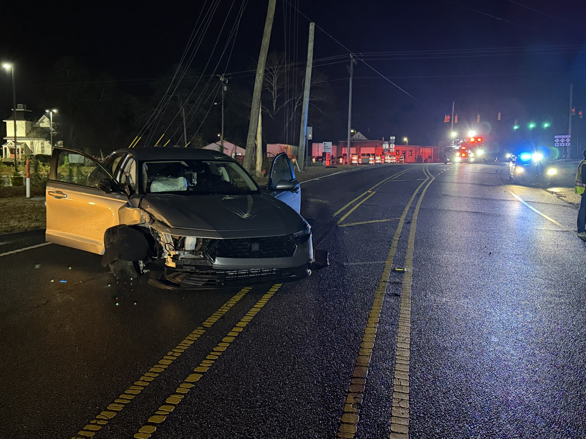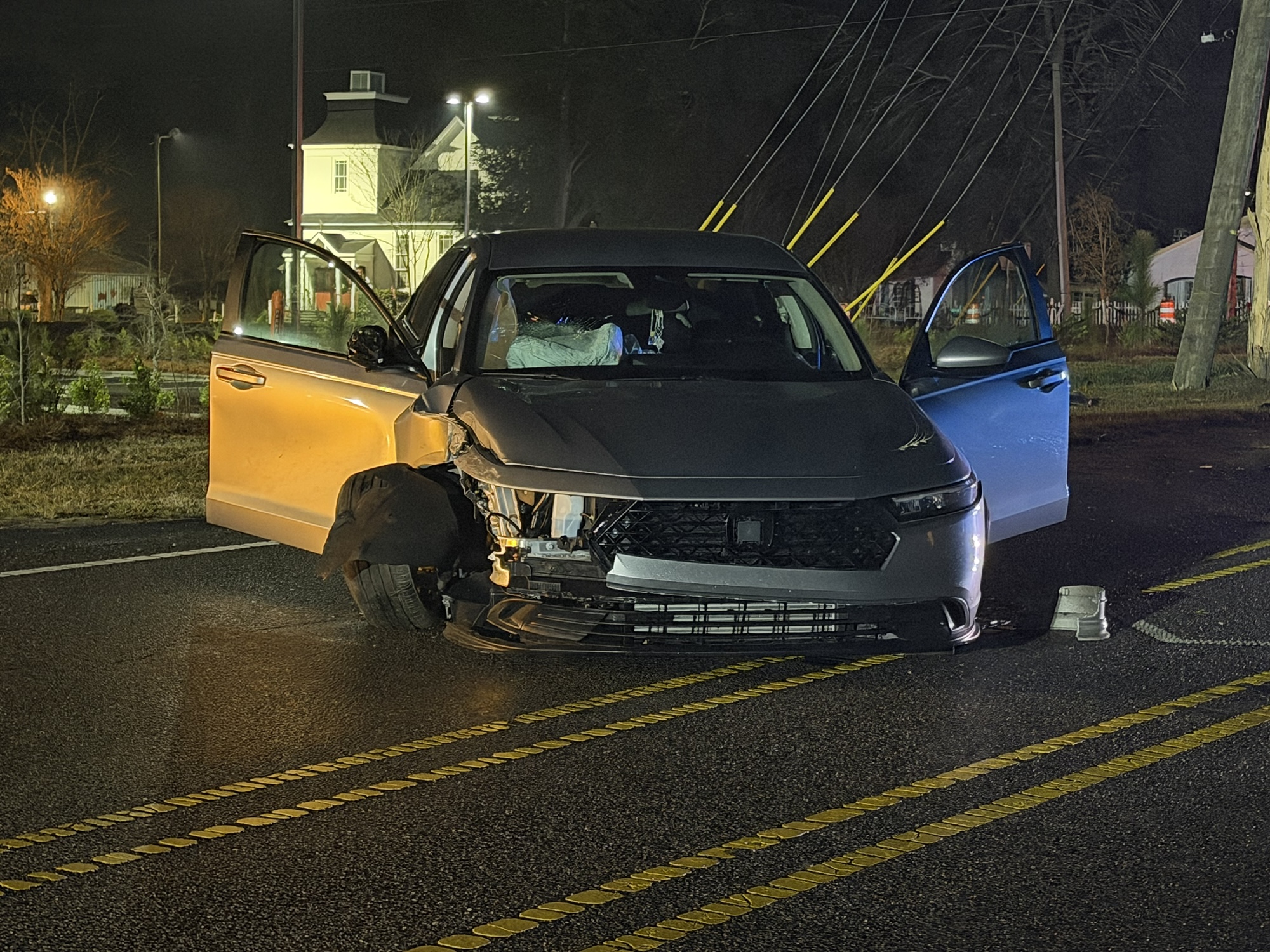 The single vehicle crash happened around 10:45 PM when the driver of a 2025 Honda Accord became distracted, ran off the right side of the road, and hit a utility pole with enough force to break it in half. Troopers said two people were inside the vehicle at the time, and neither was injured.
