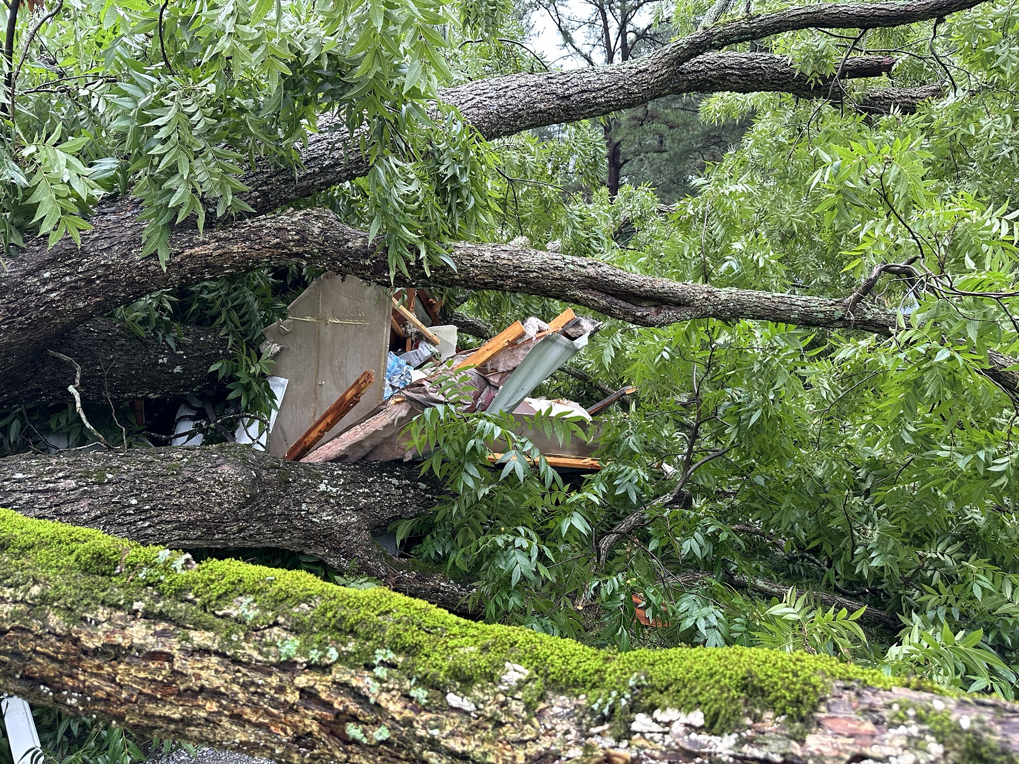 One tree fell onto a mobile home off of Niagara Carthage Road in Carthage, causing major damage, taking down a power line with it that split a power pole. Authorities closed Niagara Carthage Road near Vass-Carthage Road around 5 p.m. due to this event, and the road is still closed at time of publication due to lines being in the road.
