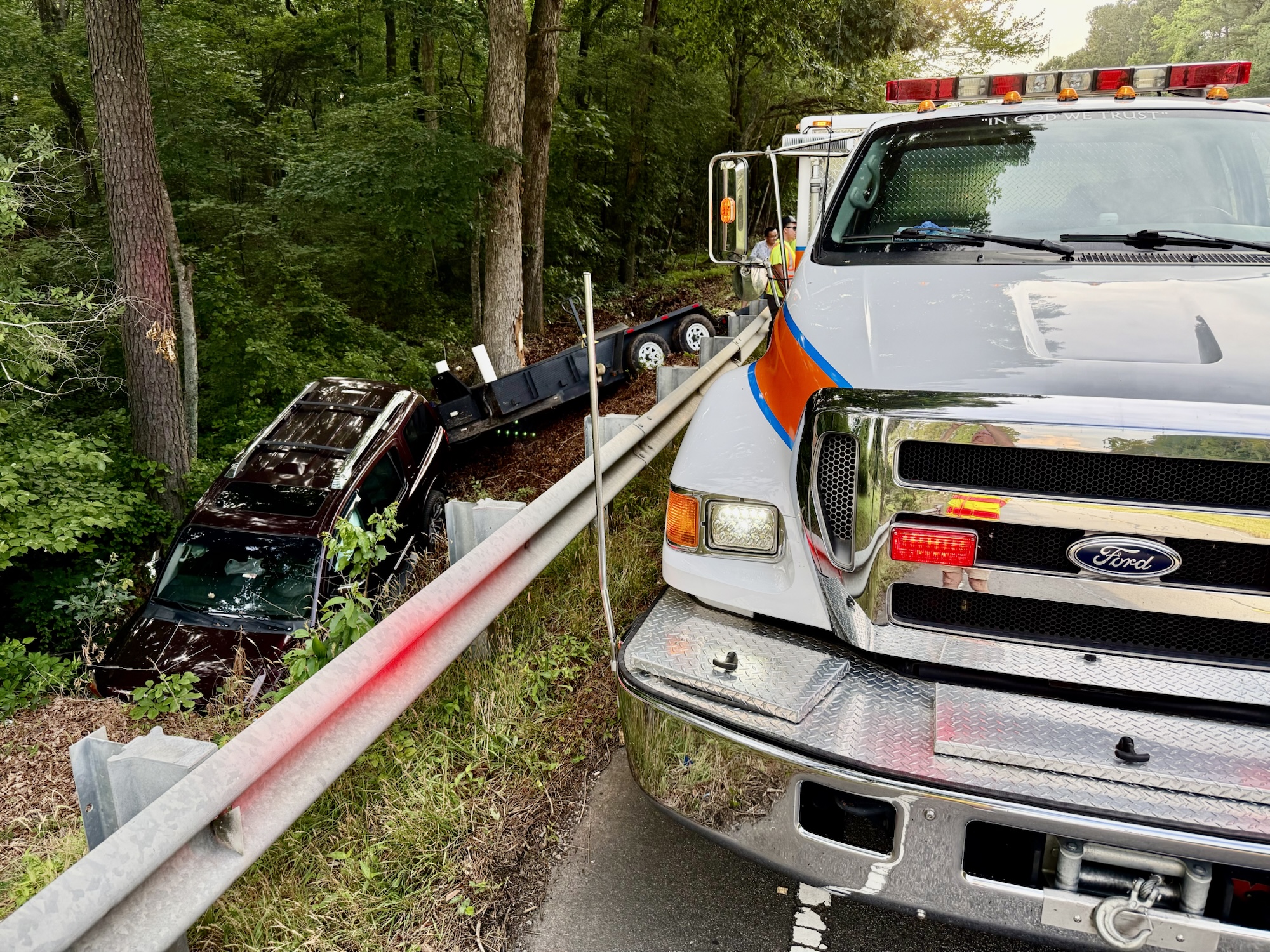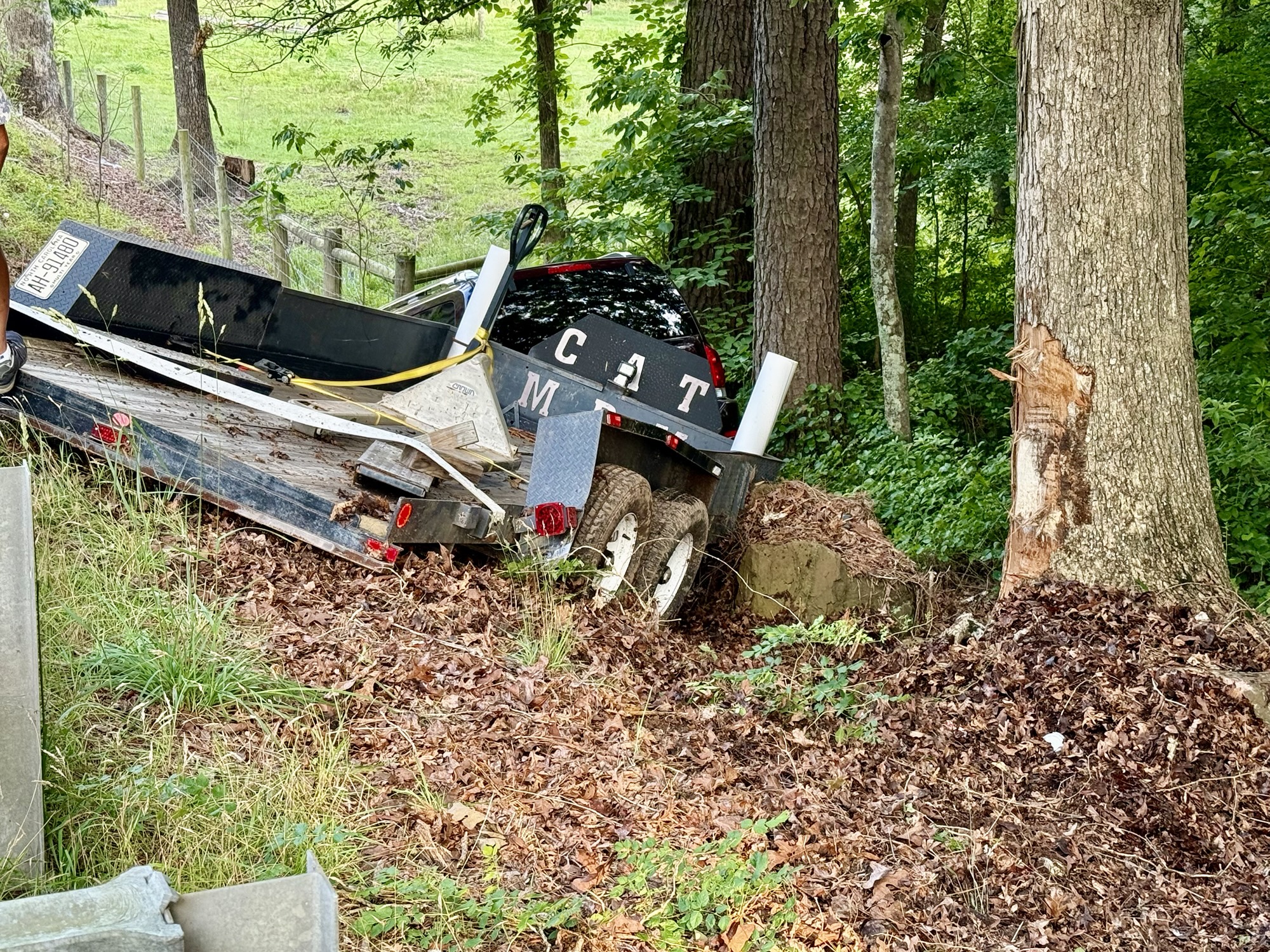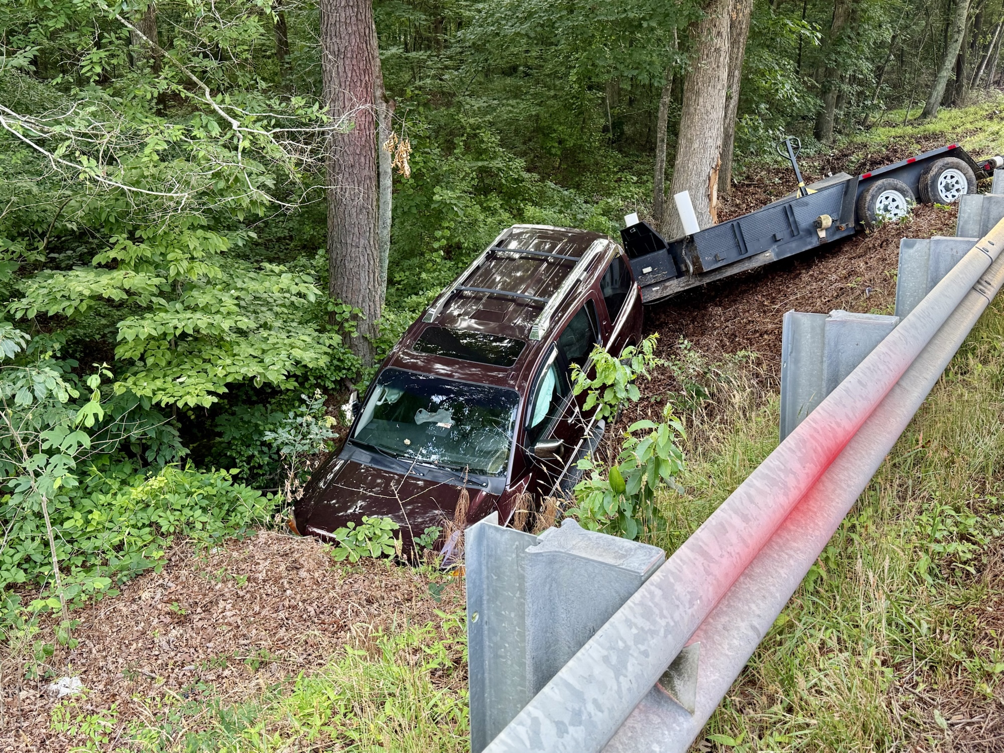 A driver is lucky to be unharmed after a dramatic crash sent his Nissan Armada and trailer off N.C. Highway 24-27 and into a creek near Carthage on Wednesday evening.