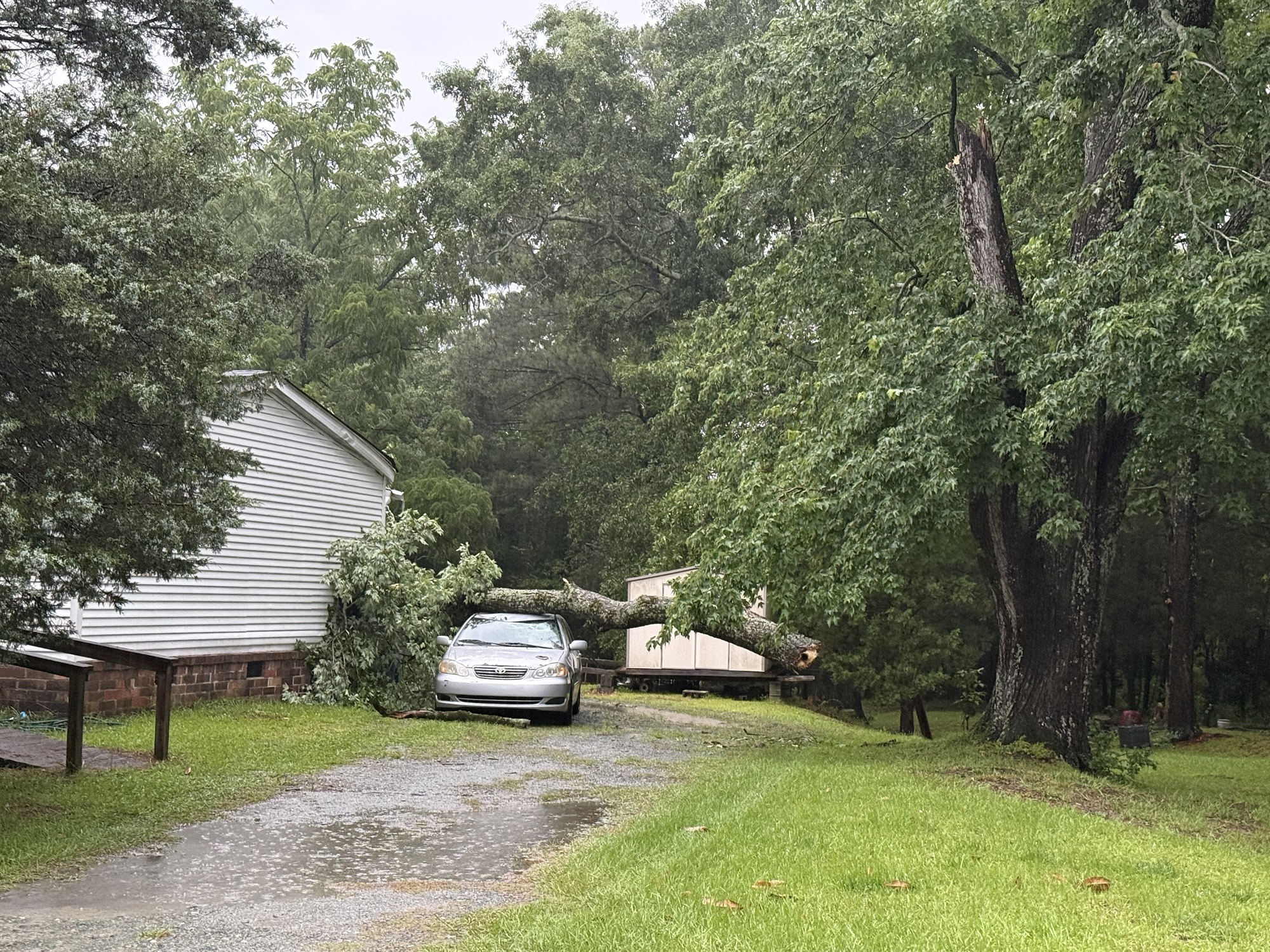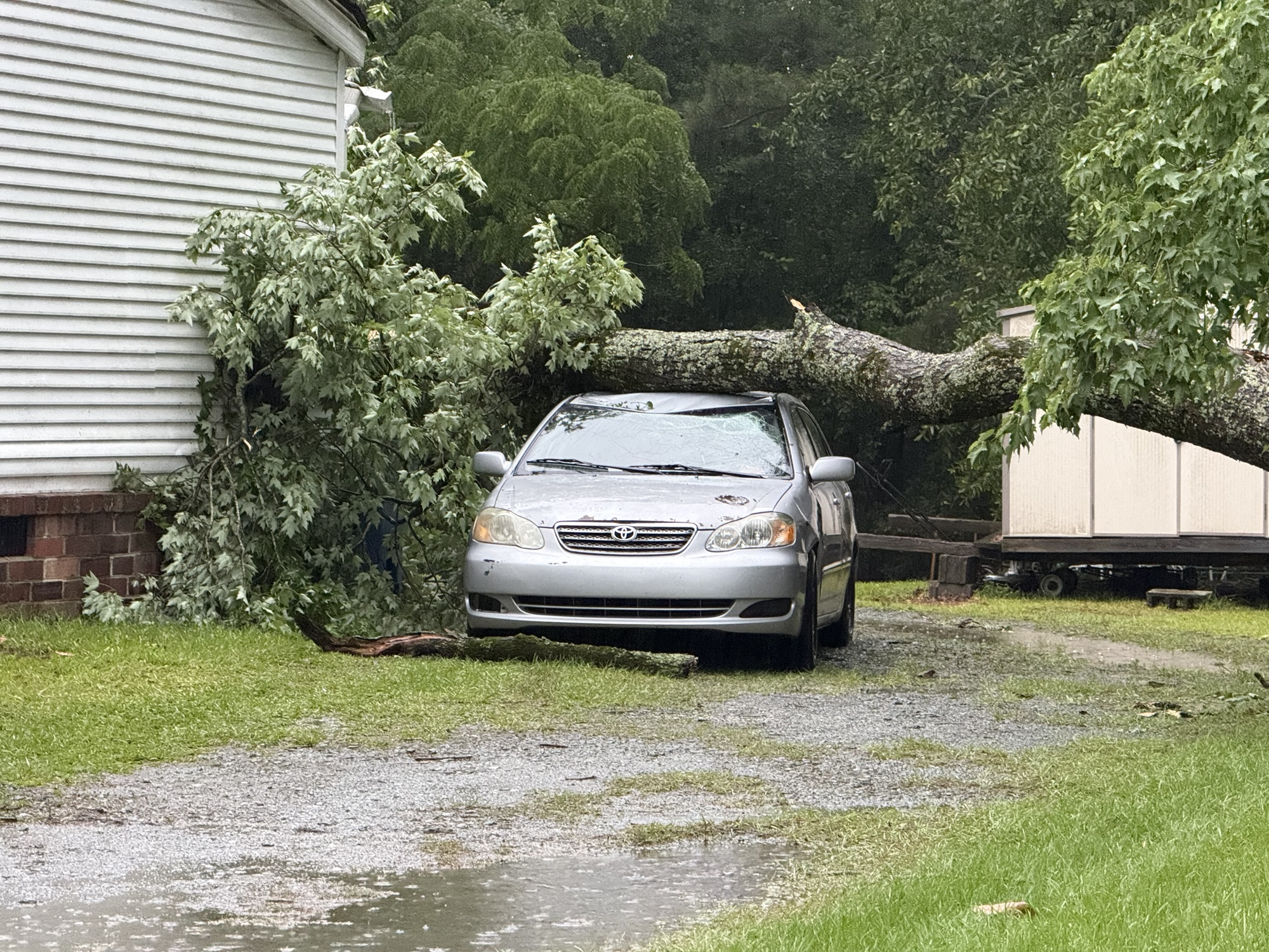 A large tree came crashing down on a car and reportedly struck part of a house in Vass on Thursday evening as strong storms moved through the area.