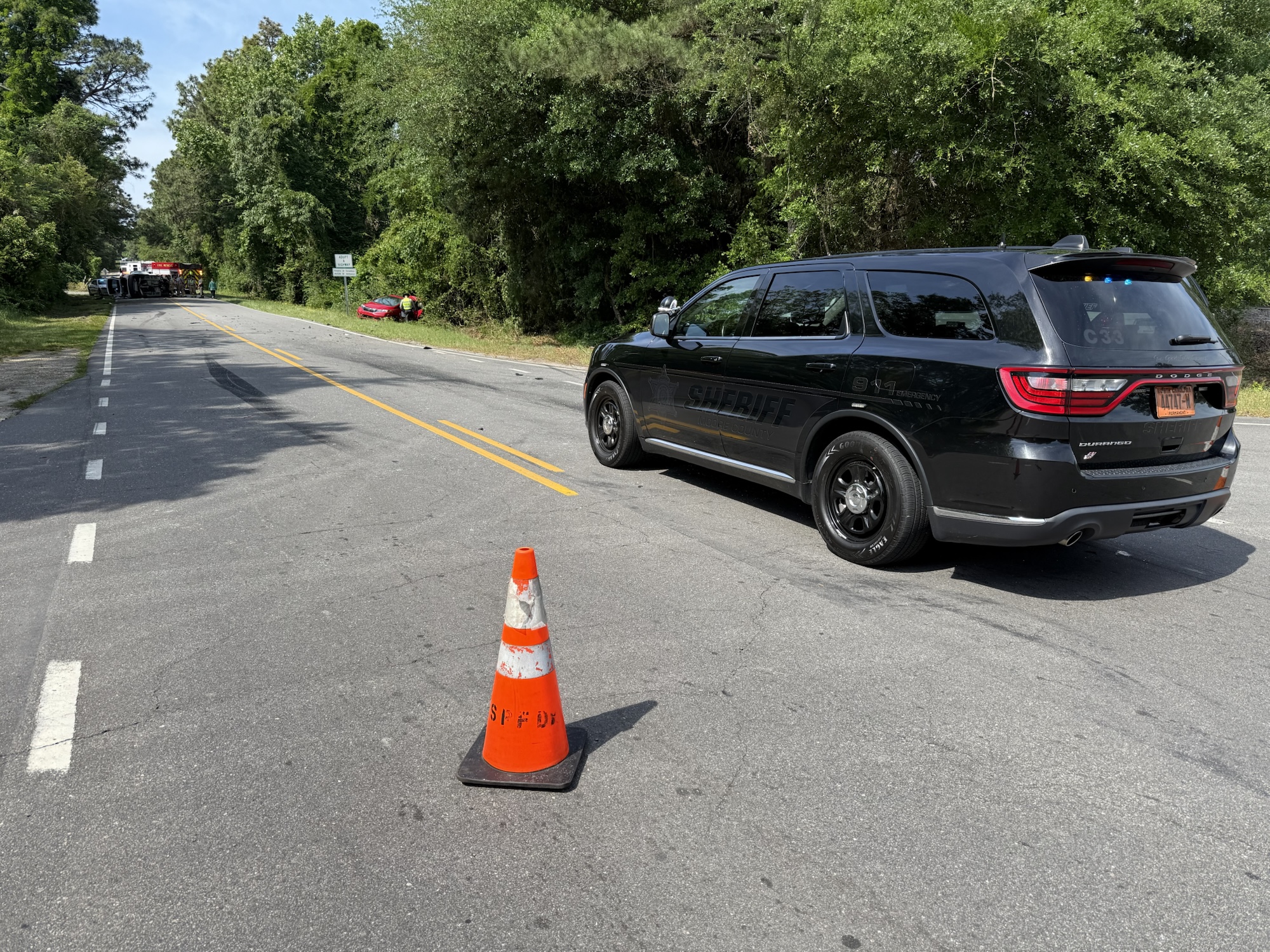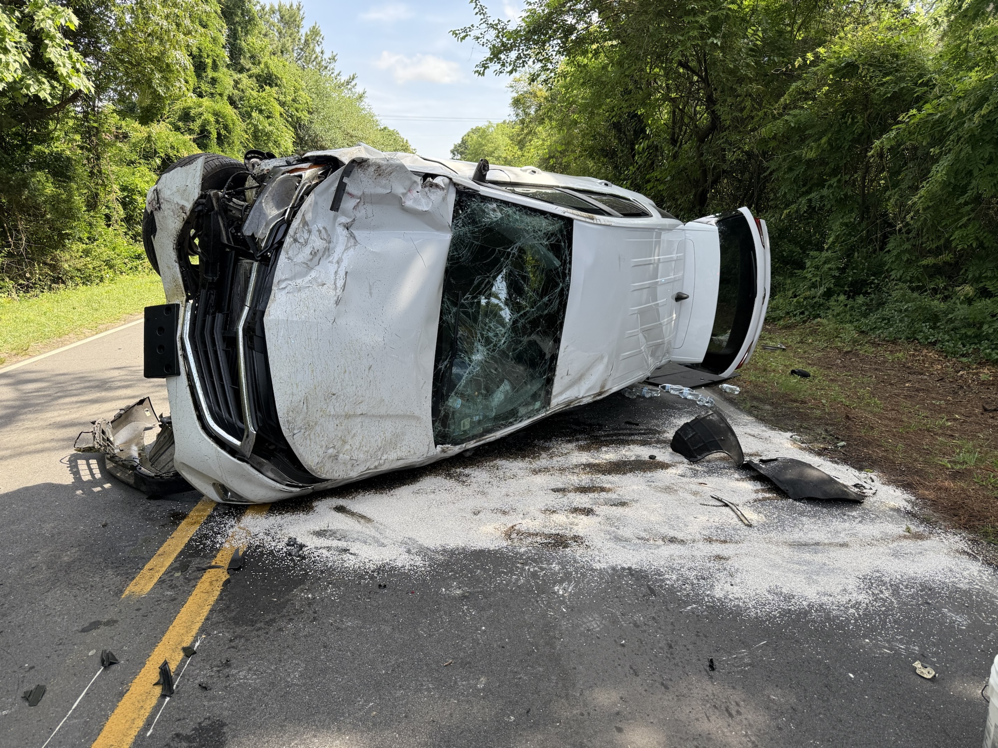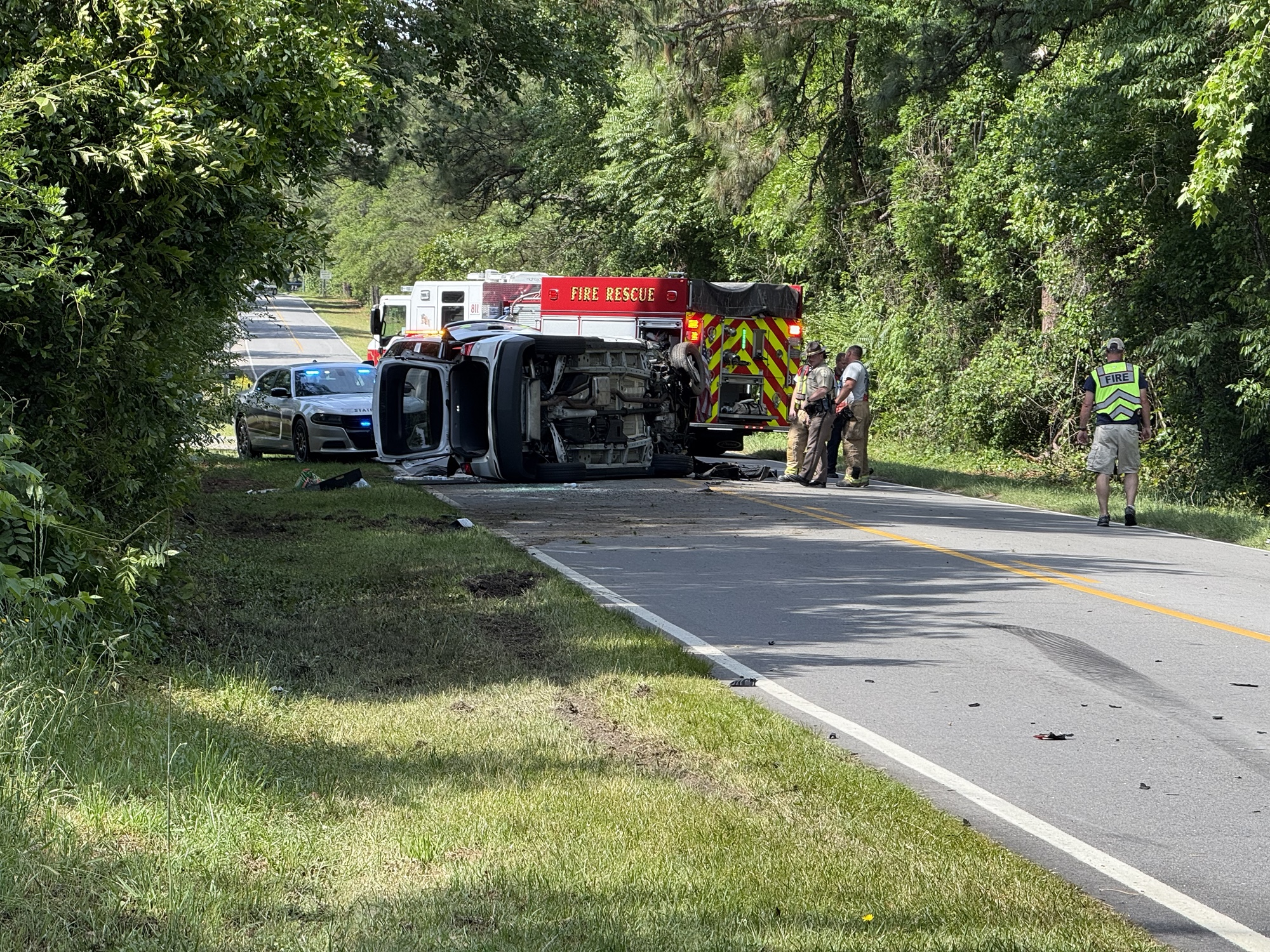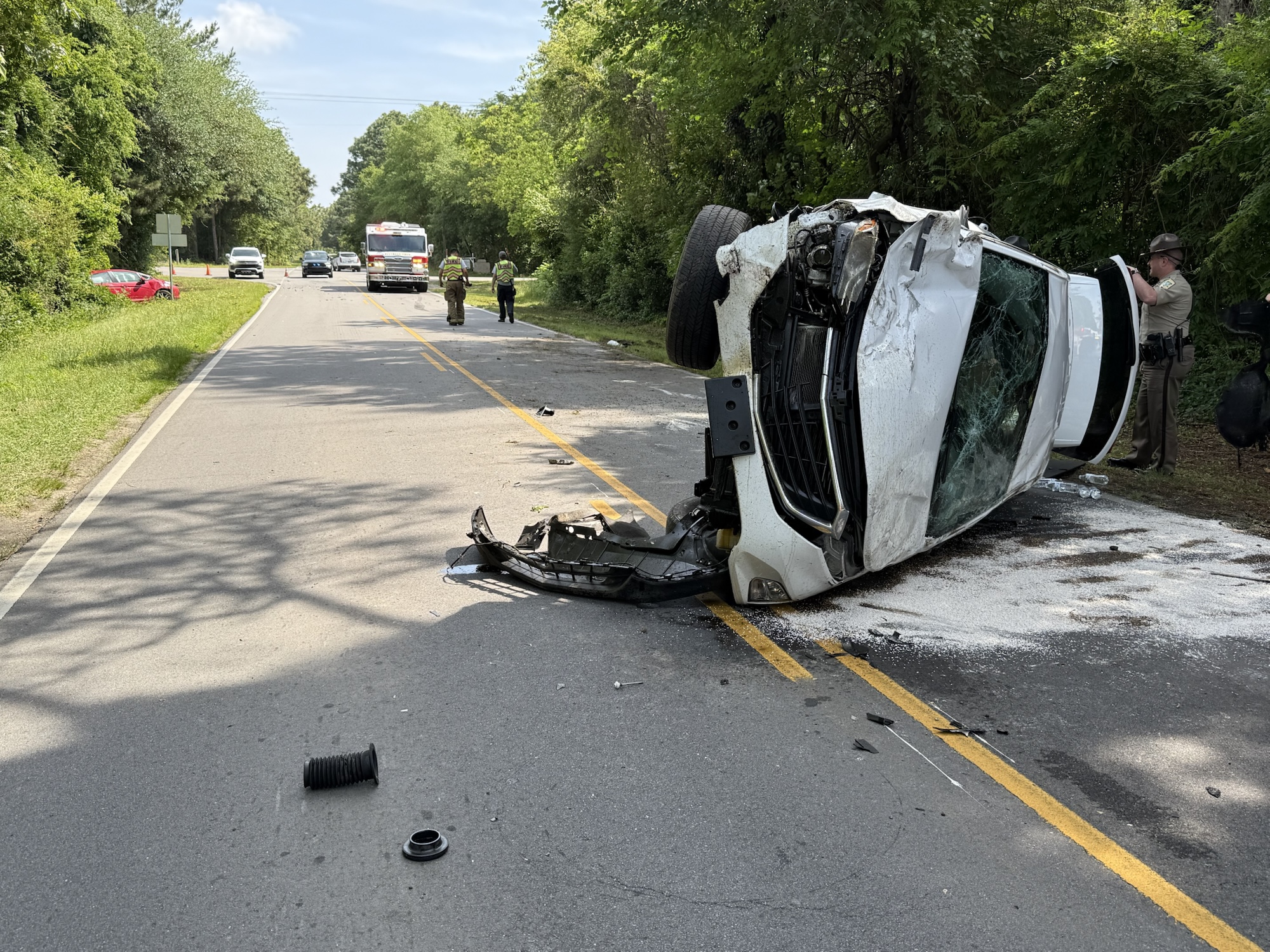 The crash occurred around 10 a.m. when two vehicles collided, causing one to run off the road and the other to flip onto its side. Emergency crews responded quickly, and a medical helicopter was dispatched for one of the injured individuals. However, the patient refused air transport and was instead taken to the hospital by ambulance.