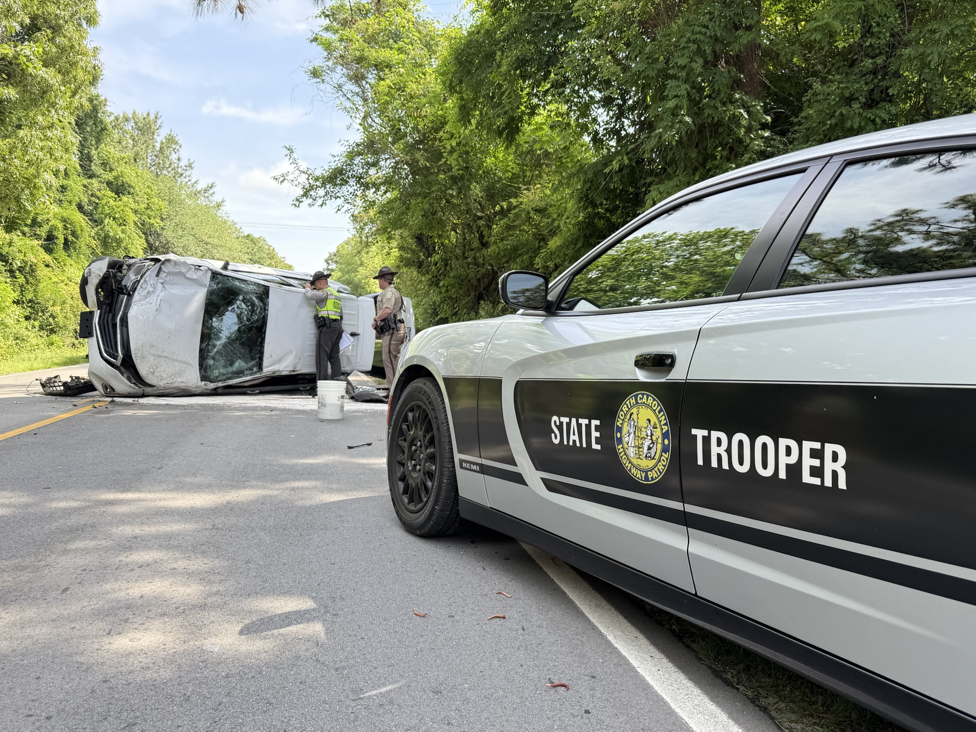 A two-vehicle crash closed a portion of North May Street near Yadkin Road late Saturday morning, sending three people to the hospital and leaving one vehicle overturned.