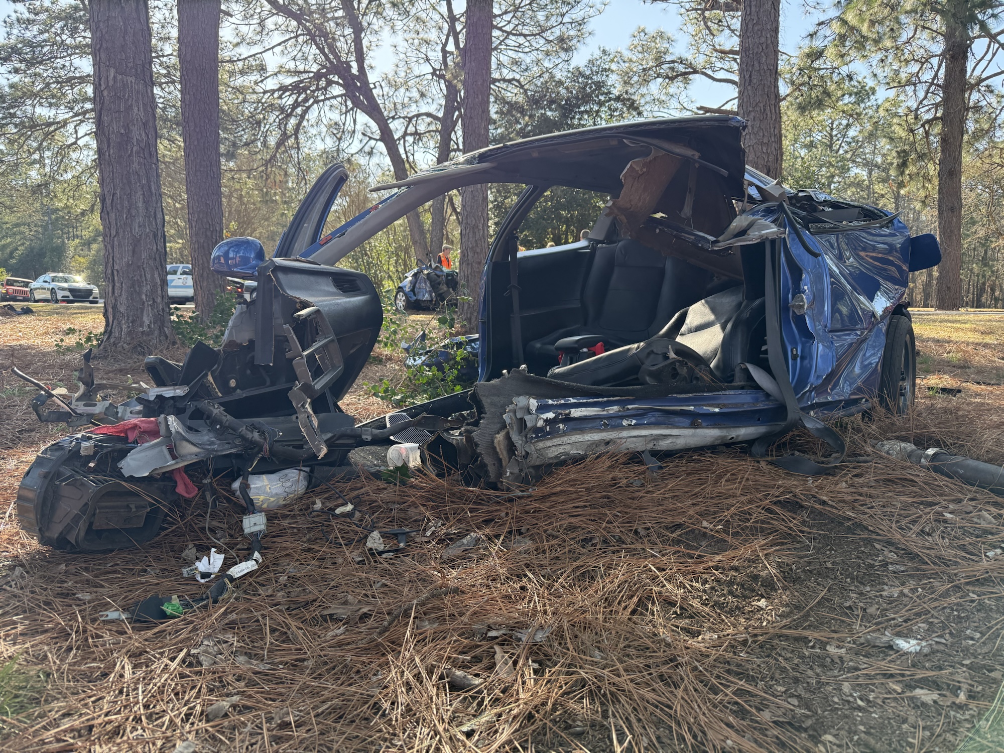 Troopers investigating the crash say that a Honda hatchback and a Chevy SS were traveling northbound at speeds of at least 100 miles per hour when the driver of the Honda lost control. The Honda crashed into the Chevy, causing both vehicles to veer off the right side of the road and slam into several trees, according to investigators. The force of the impact split the Honda in half.